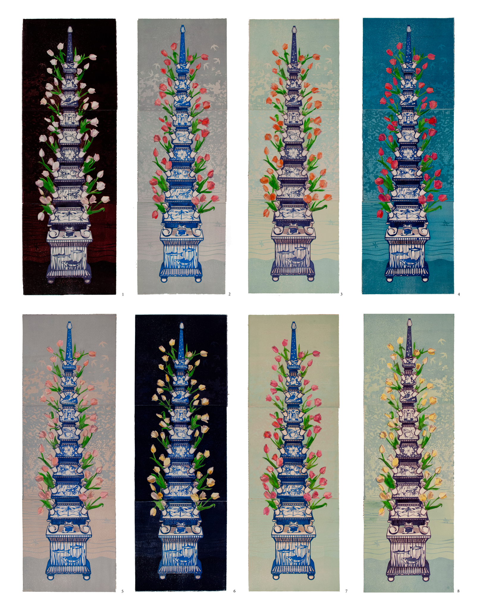 Dit is een serie van acht hoogdrukprenten rond het thema tulpenvaas.