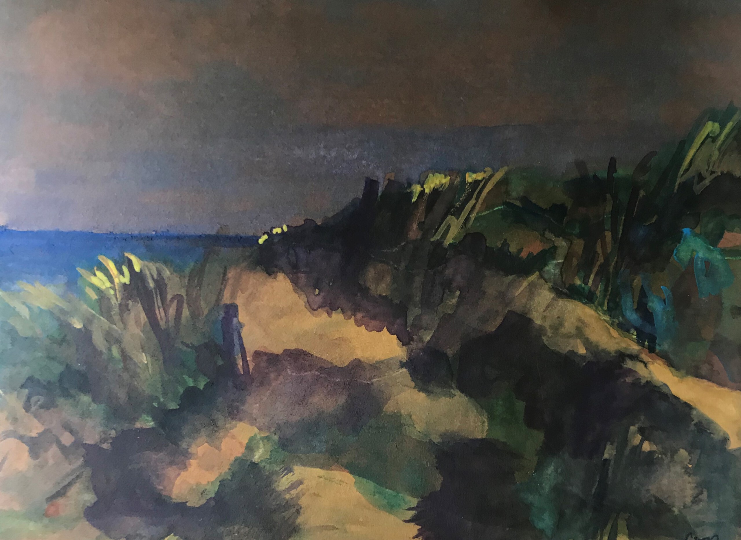 duinovergang aquarel op bruin papier