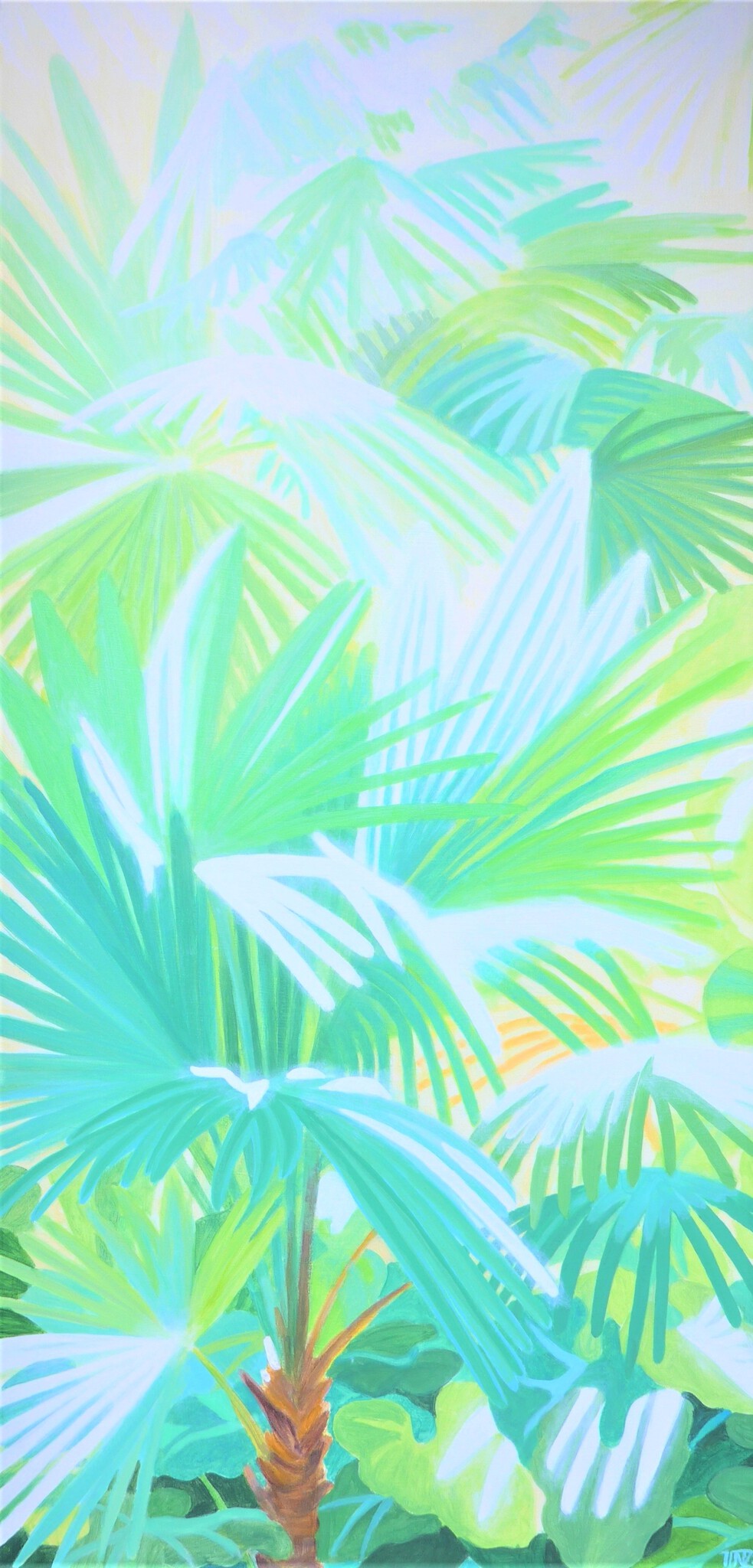 Tropische botanische inspiratie voor een tweede tuinraam. Voor dit in opdracht gemaate doek is de maat aangepast aan de plaats waar het gaat hangen.