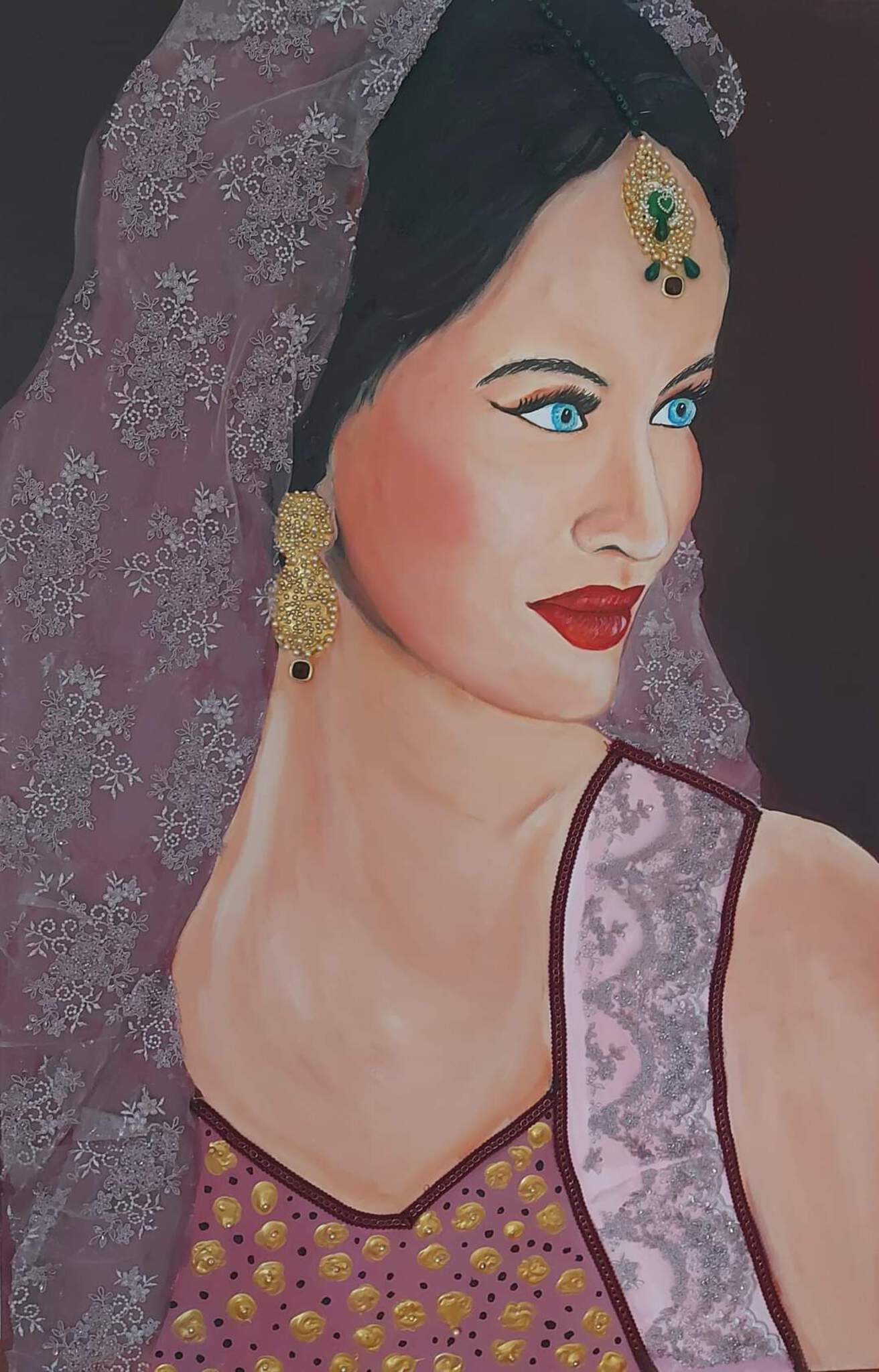 Portret van een prachtige dame, bewerkt met kralen en kant. Het portret is ingelijst en past heel mooi samen met LACE, dan wordt het een tweeluik.