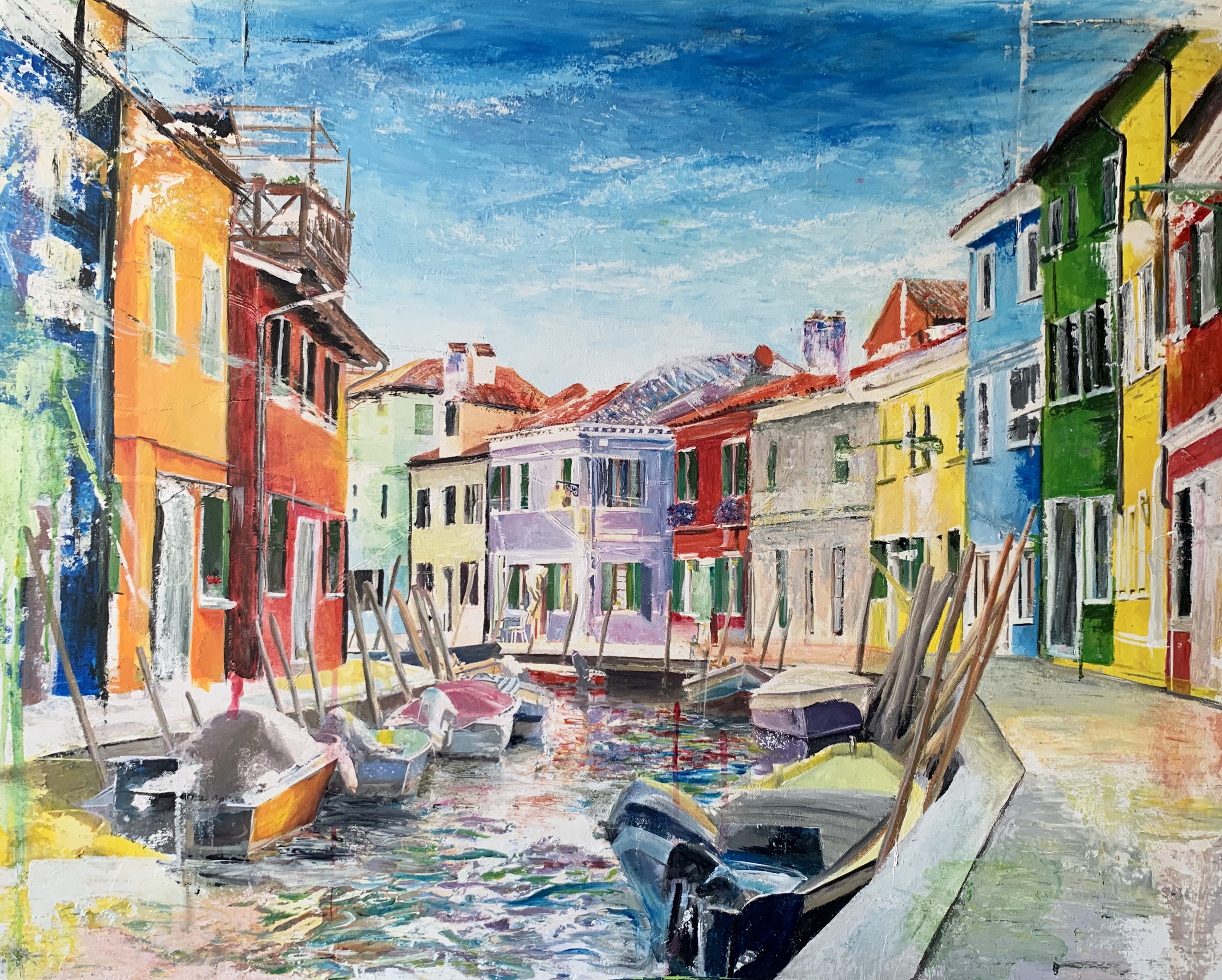 Schilderij van het plaatsje Burano bij Venetië. Techniek is acryl op canvas met transfer