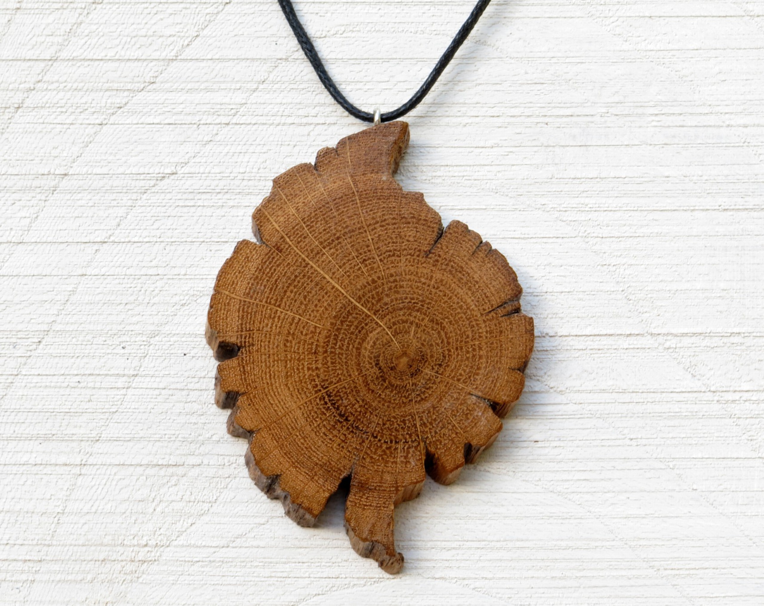 Hanger van doorsnede eikentak met jaarringen. Nr. 6076. Afmetingen 80x55mm. Dikte 6mm. Het zwarte waxkatoenen koord incl. sluiting heeft een lengte van 30cm.