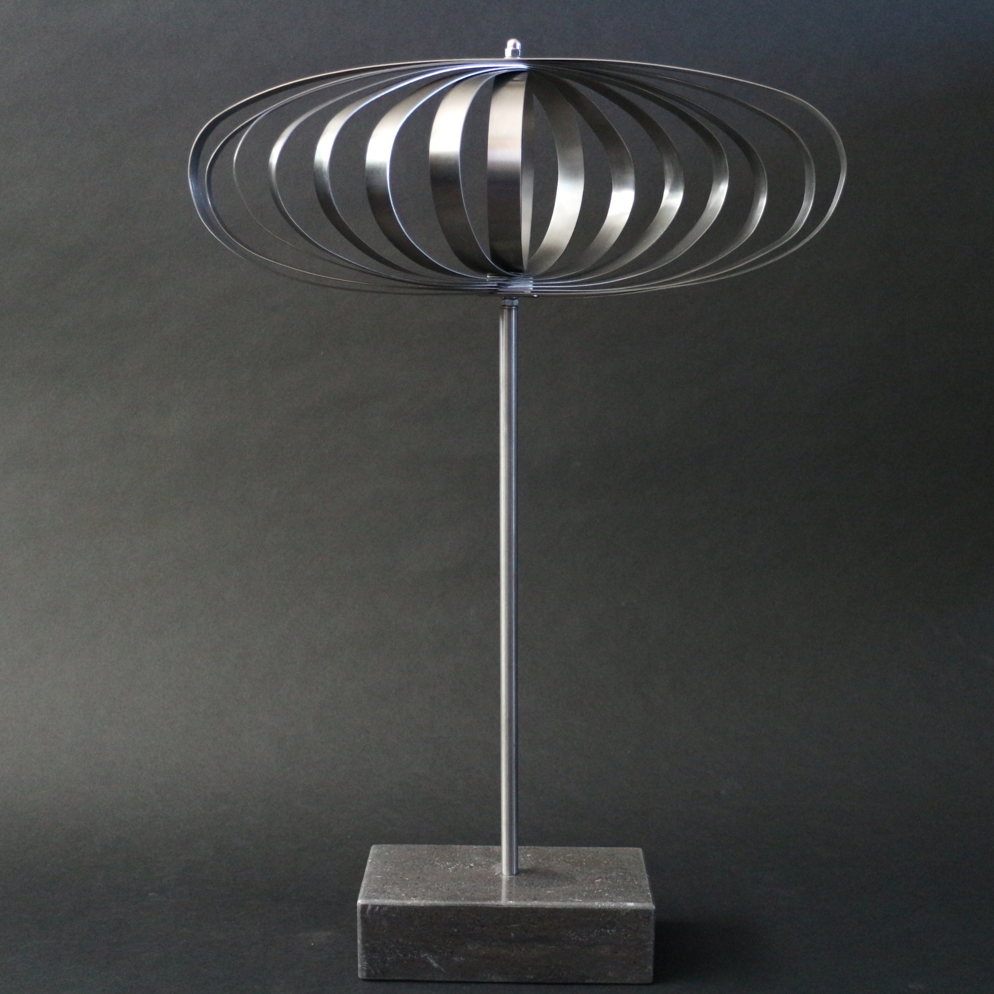 Het sculptuur symboliseert de ellipse banen die planeten afleggen rond een zon. Gemaakt uit 2 cm breed RVS strip. Draaibaar gemonteerd op een hardstenen sokkel. Kan uitstekend buiten staan.
