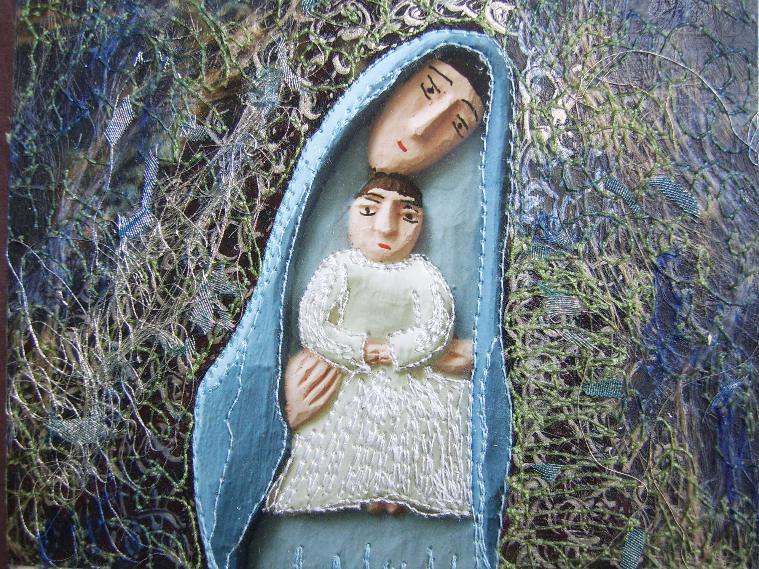 Ik ben een materialen mens, en maak samenvoegingen van verschillende materialen; foto’s, stoffen en borduursels, soms ook gecombineerd met hout, lood en steen, op wisselende formaten