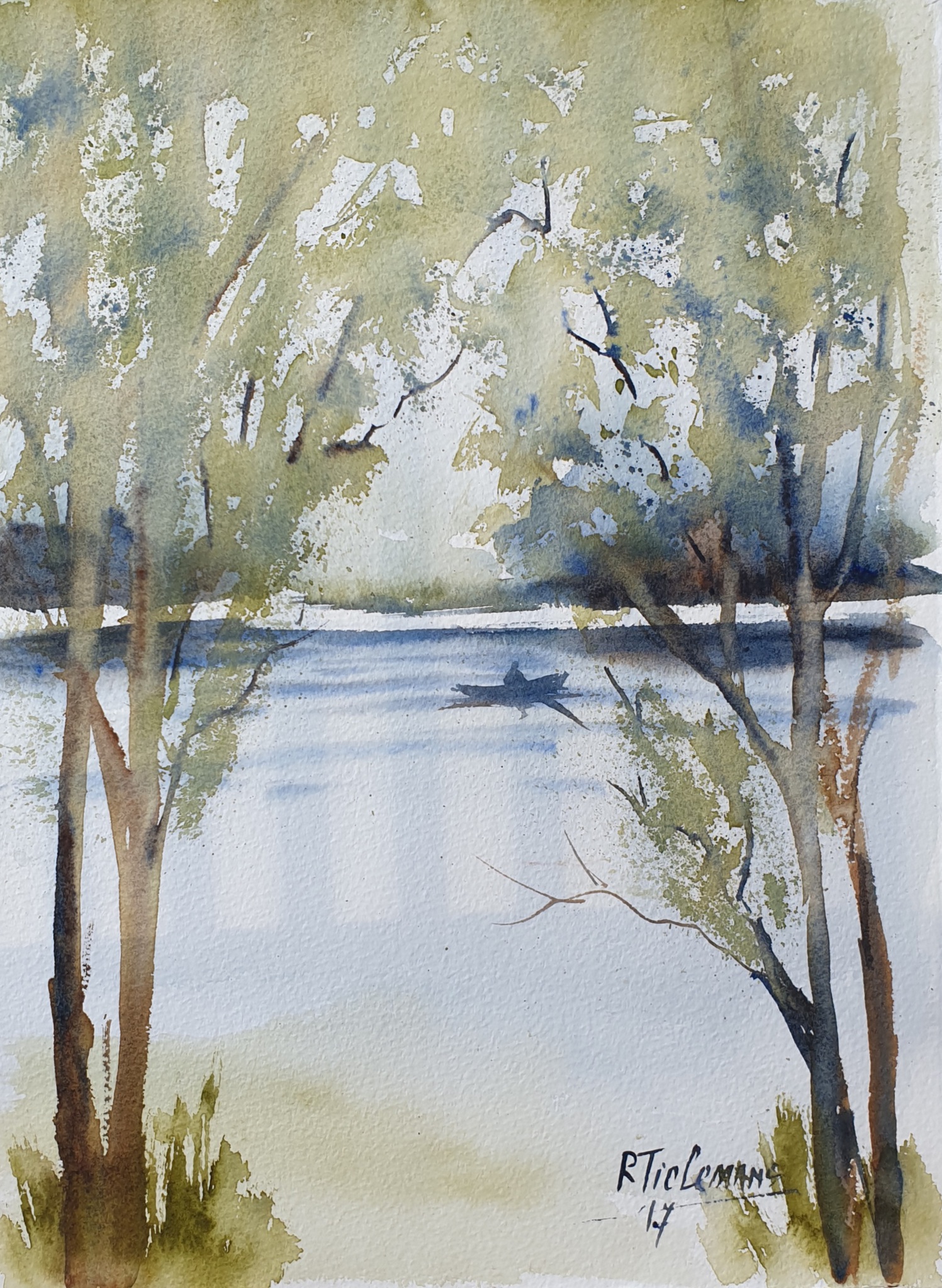Kunstprinten van dit werk zijn ook verkrijgbaar op: https://www.werkaandemuur.nl/nl/shopwerk/Bootje-op-de-Rivier/1722915 Een sfeervol aquarel dat een rustgevend landschap weergeeft. Twee slanke bomen omlijsten een vredig meer met een zacht vervaagde horizon. Op het water is een silhouet van een bootje te zien, wat een gevoel van sereniteit toevoegt. De schilder heeft gebruik gemaakt van lichte groentinten en subtiele blauwtinten om een natuurlijke en ontspannen sfeer te creëren. De losse penseelstreken en transparantie benadrukken de eenvoud en kalmte van de scène.