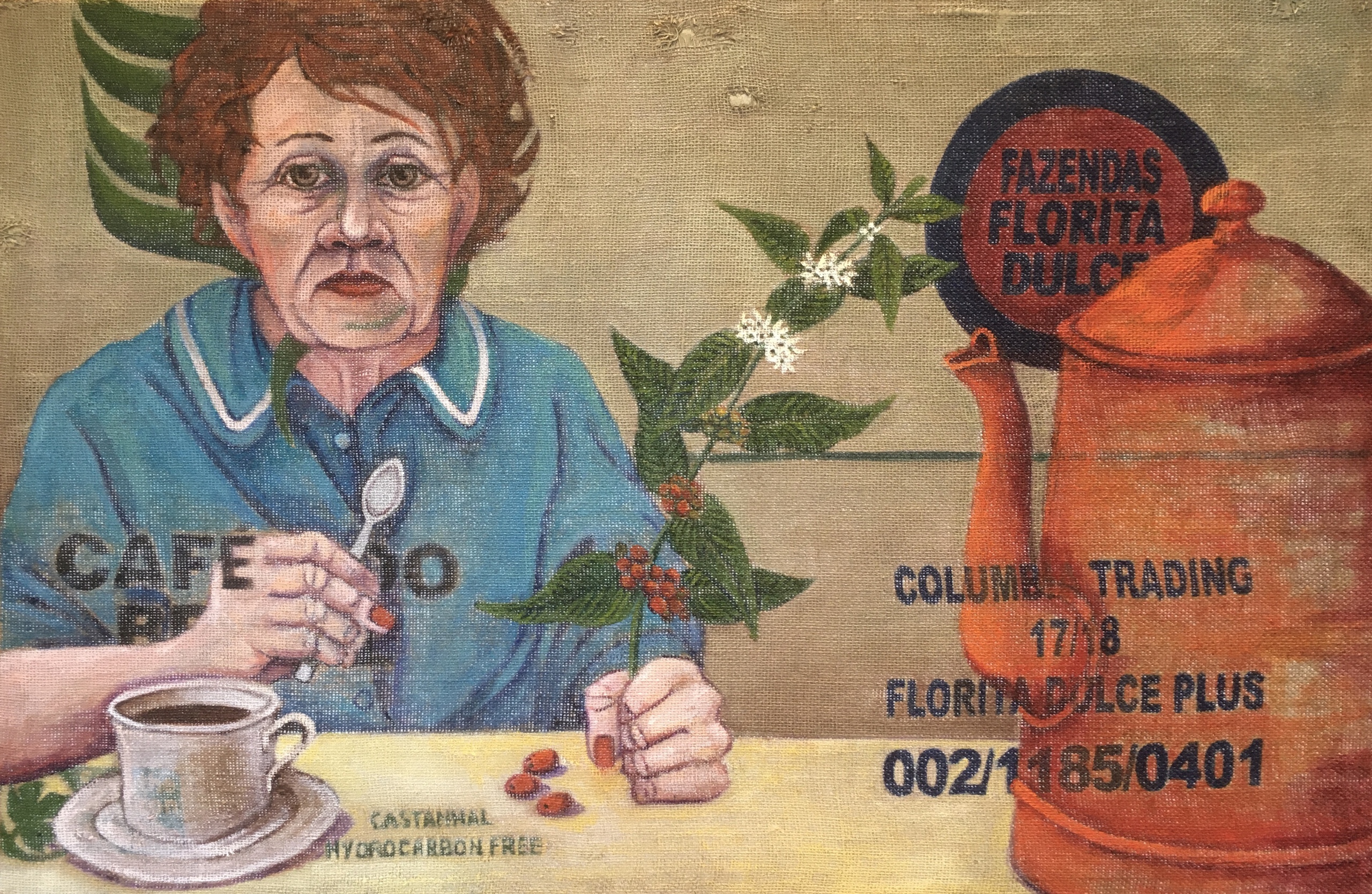 A coffee before I go. My daily ritual. Found an old coffebean bag. This became the carrier of this painting. The branch of the coffeeplant and the beans reminds us where our coffee comes from