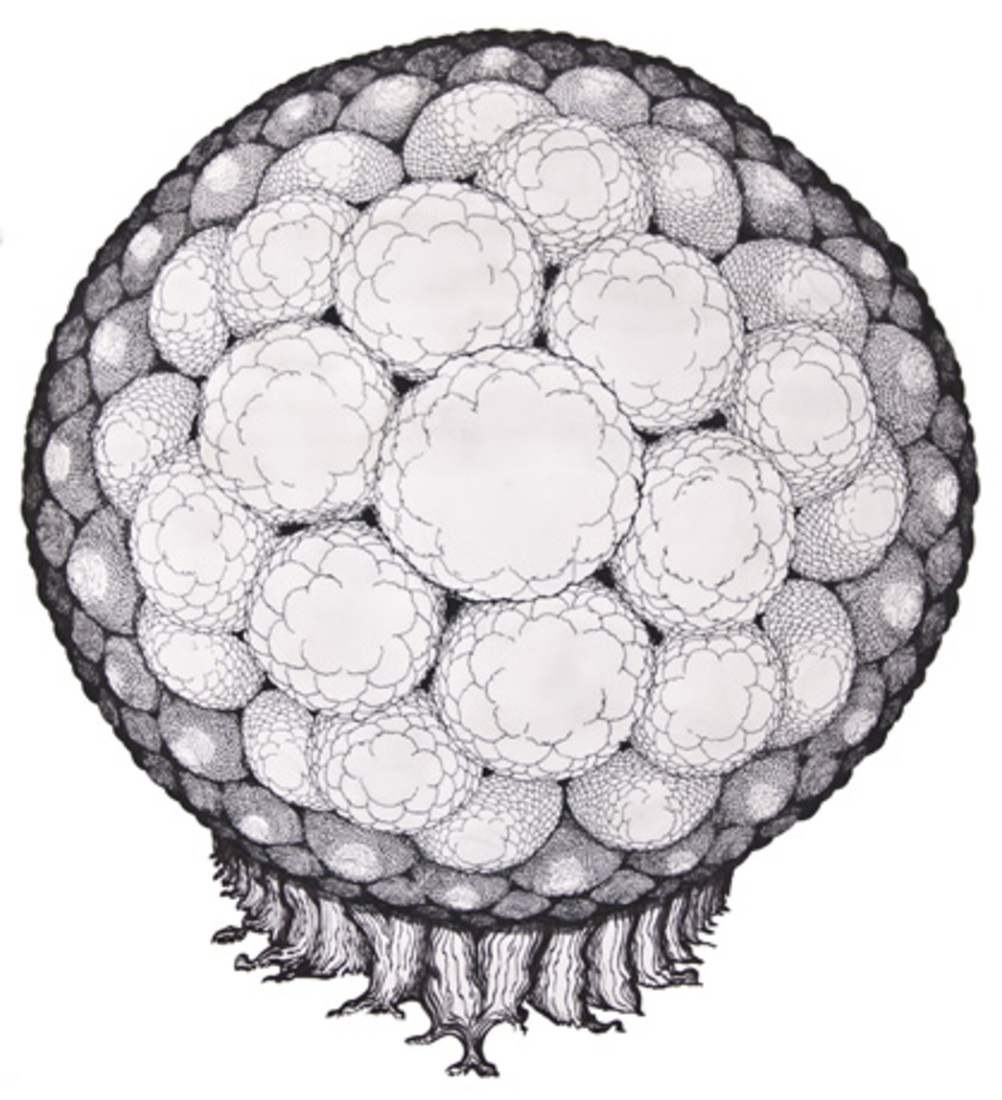 De levensboom die bestaat uit een ronde vorm die weer bestaat uit ronde vormen ad infinitum, zodoende de oneindigheid te representeren.