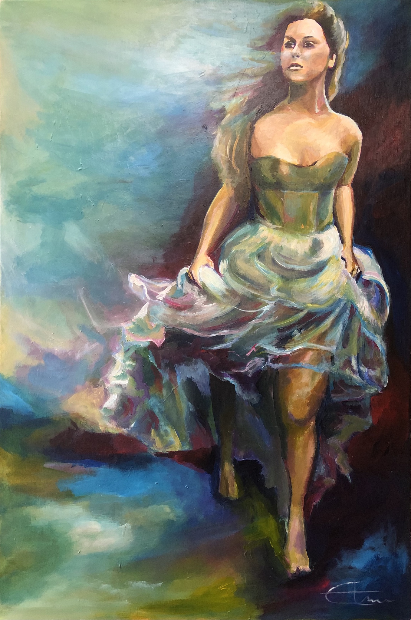 Schilderij Figuratief Blauw Groen Vrouw Lopen
