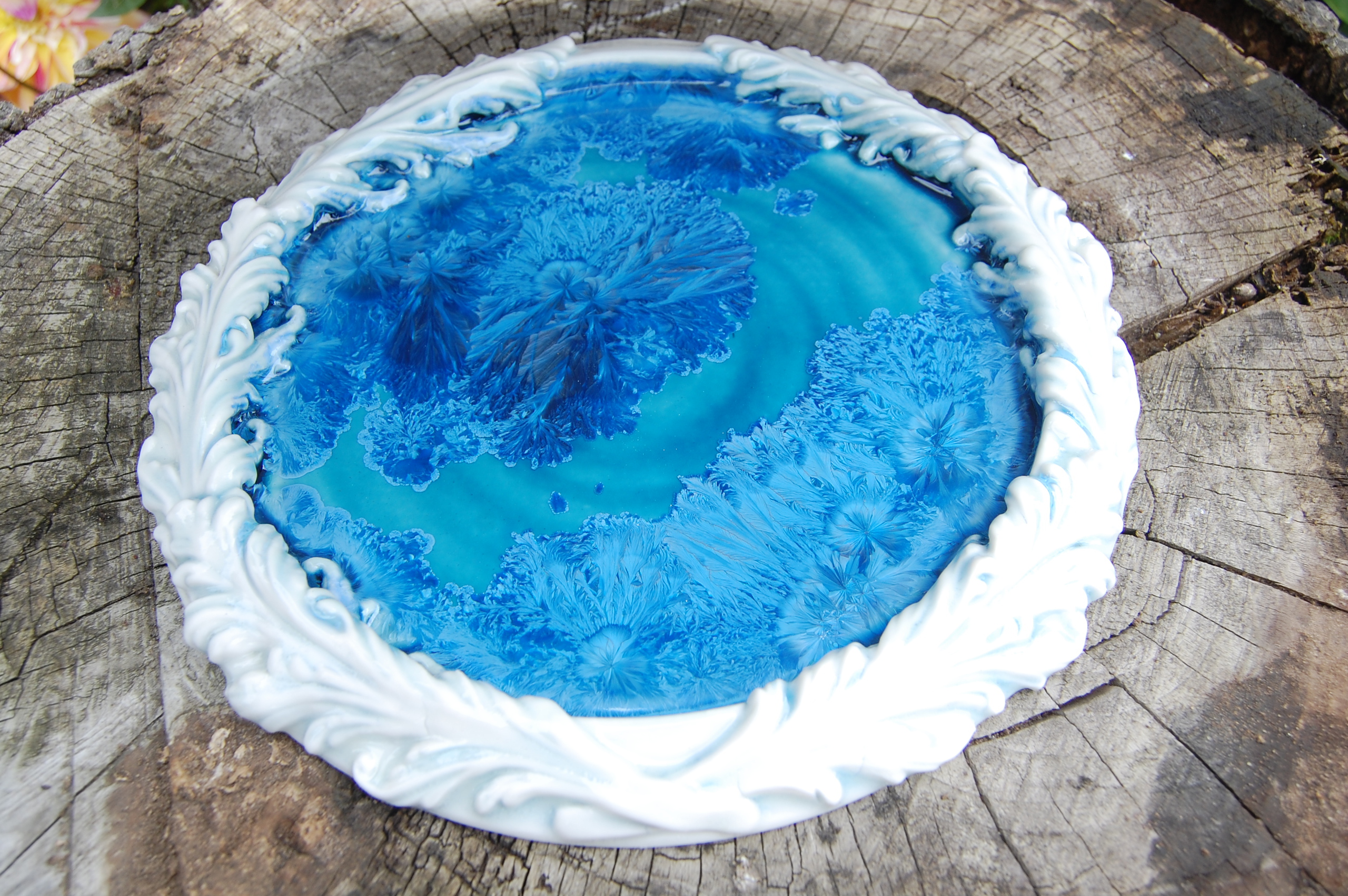 Geheel uit Porselein vervaardigd wandobject, een sieraad voor uw muur. Gedraaid en op de rand uit mal, Acanthusbladeren van Porseleinklei, geglazuurd met het prachtige MakroKristalglazuur in kobalt blauw. Wanneer het belicht wordt komen de prachtige (verenvormen van) kristallen tot hun recht.