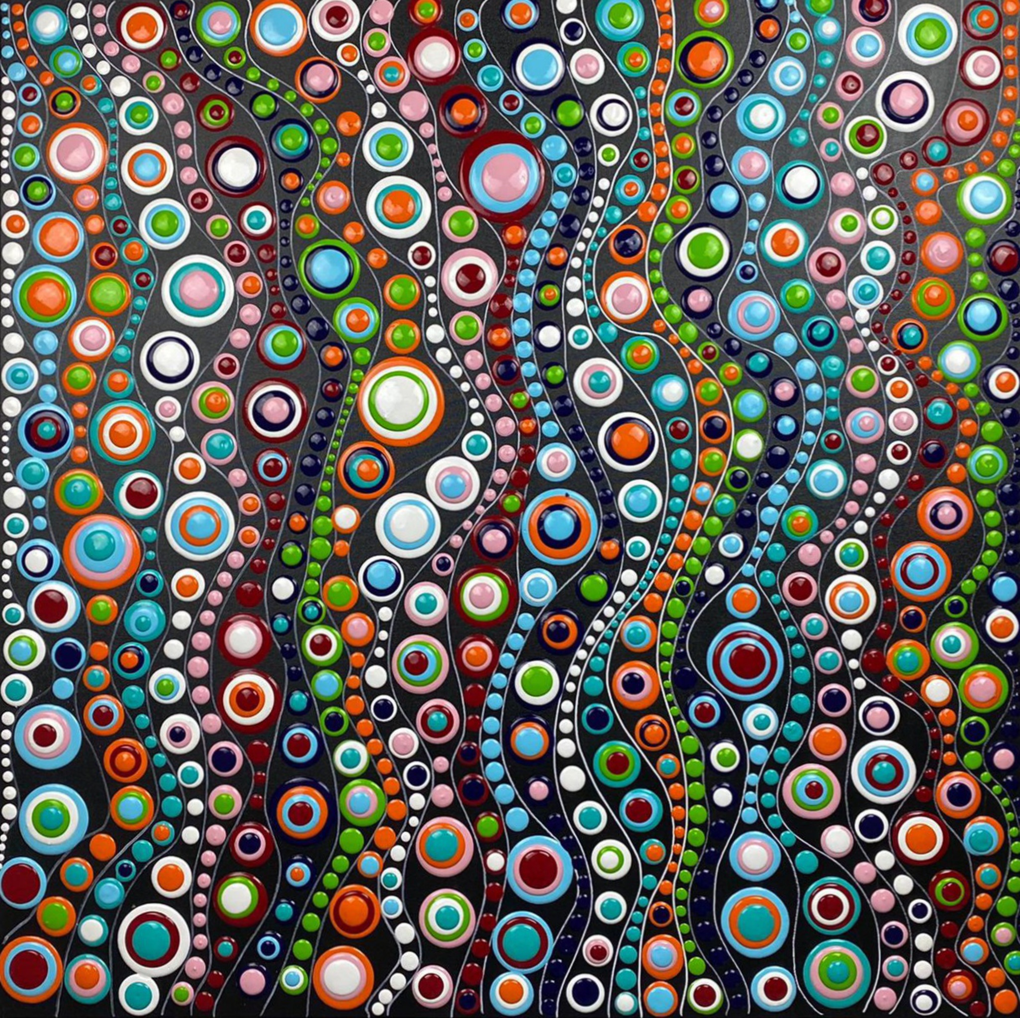 Dots, blobs in de kleuren roze, diverse kleuren blauw, wit, oranje en rood op een zwarte ondergrond. Doordat de blobs op het schilderij liggen, krijgt het een heel mooi 3D effect. Afgewerkt met een hoogglans vernislaag. Formaat 90x90x4 cm. De koper is de eerste eigenaar. Handgesigneerd en met echtheidscerificaat. Als het schilderij verstuurd moet worden, dan wordt het goed verpakt in een mdf kist.