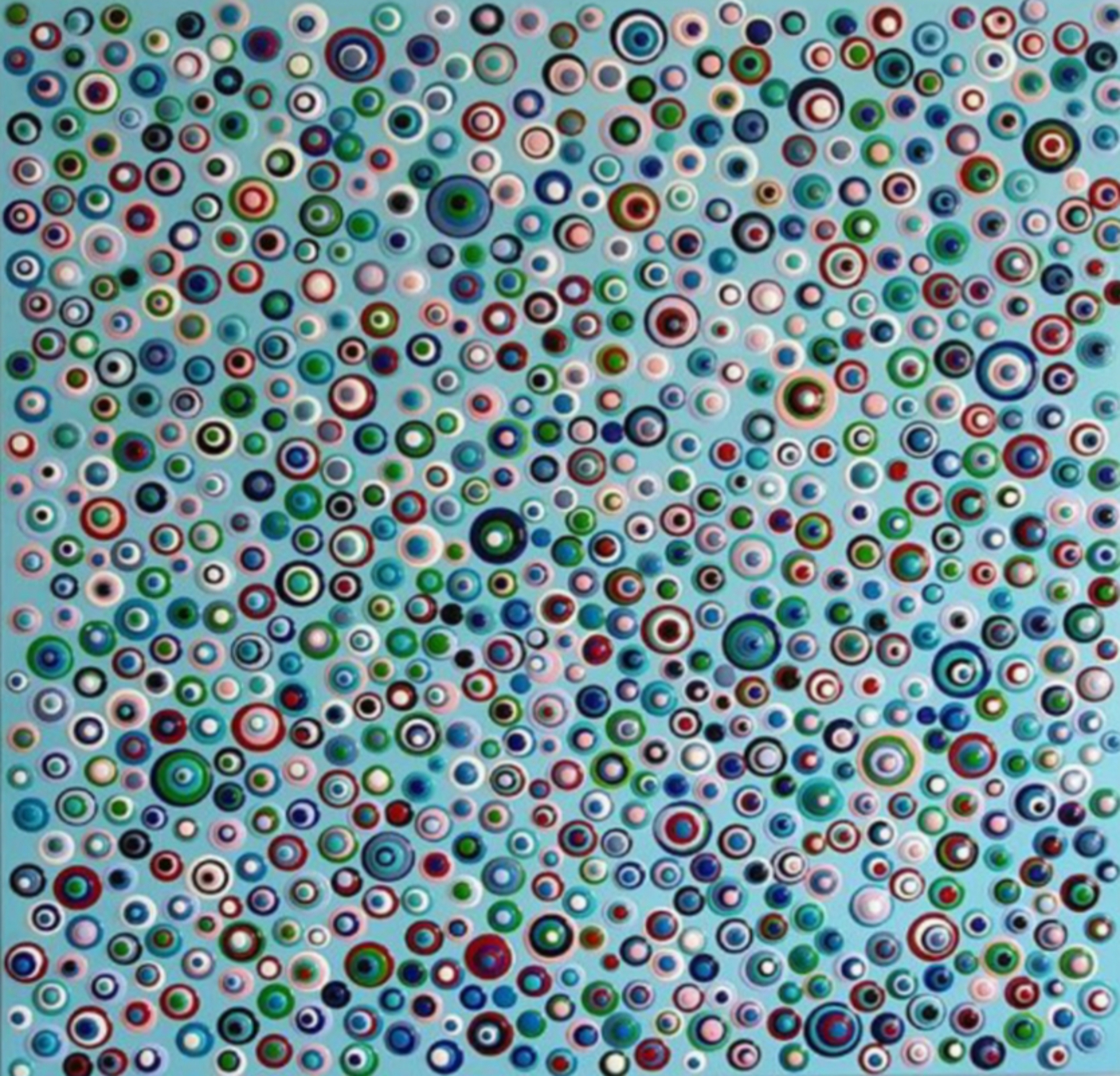 Blobs, dots in diverse kleuren op een licht blauwe achtergrond. Doordat de blobs op het schilderij liggen, krijg je een heel mooi 3D effect. Afgewerkt met een hoogglans vernislaag. Formaat 100x100x2 cm. Rechtstreeks van de kunstenaar, de koper is de eerste eigenaar. Handgesigneerd en met echtheidscerificaat. Als het schilderij verstuurd moet worden, dan wordt het goed verpakt in een mdf kist.