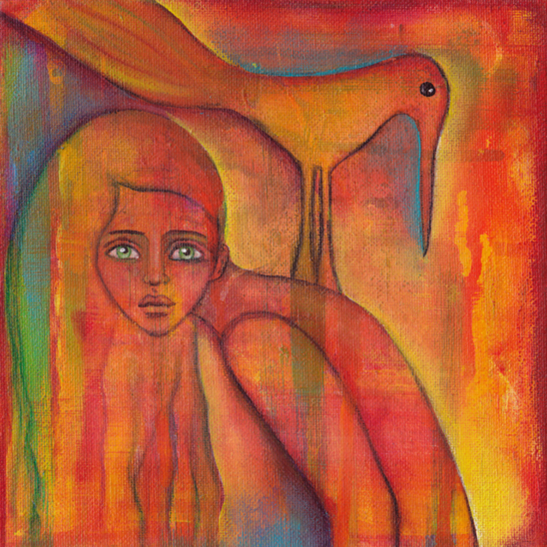 Schilderij Meisje Oranje Acryl Vogel Spiritueel Vrouw Klein Canvas Figuur Kunst Surreëel Geschenk Intuitief Kleurrijke Inspirerend Handmade Kunstcadeau Presents Cadeautjes Denthe Minischilderij Dentheart