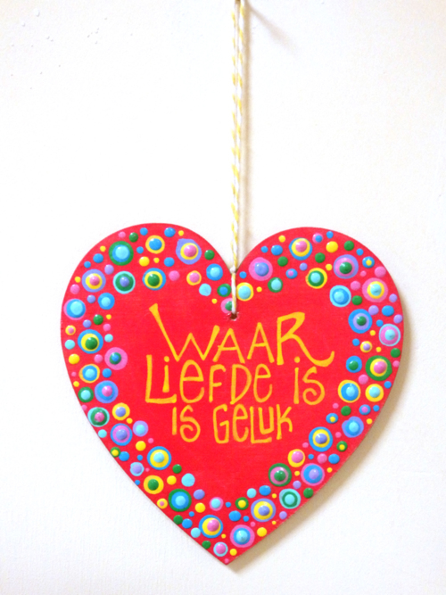 houten hartje van triplex handbeschilderd met spreuk en dots