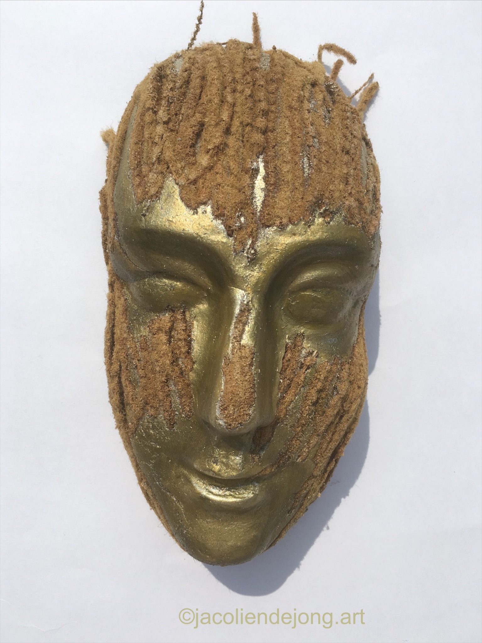 Masker van klei met daarin verwerkt de bloesem van de mannelijke tamme kastanje, beschilderd met goudverf, wandobject met draad voor ophangen