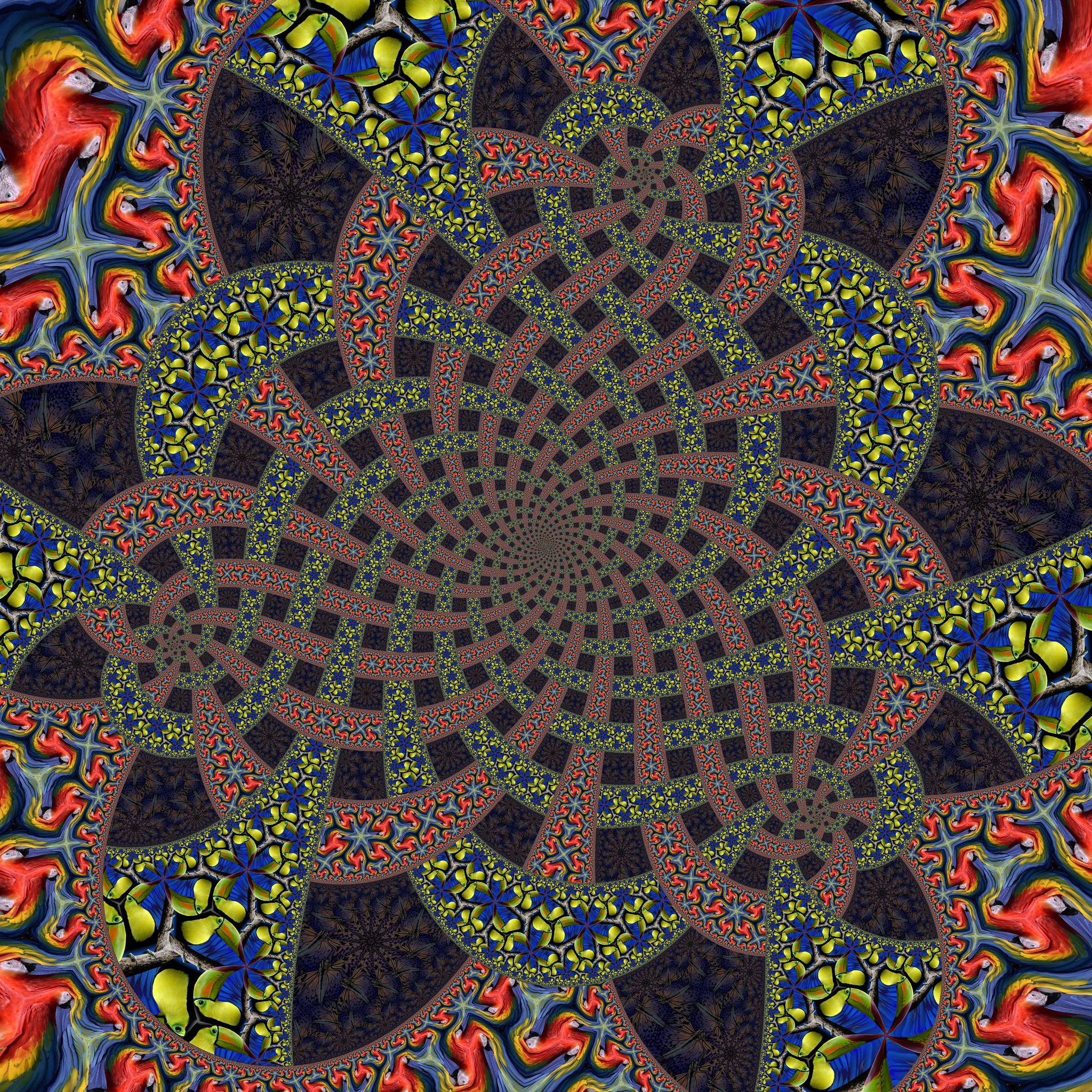 Drie spiralen, met elk 2 armen en 3 loodrechte armen, komen samen in de middelste superspiraal met 6 en 9 armen. Elke spiraalarm heeft 2 paden die de intentie hebben heen en weer te lopen. De paden zijn gemaakt van zogenaamde bandmodellen van hyperbolische geometrie afbeeldingen. De paden lopen over elkaar heen en onder elkaar door om zo een vlechtwerk te creëren. Het spiraalvormige midden ziet er donker uit, maar wordt lichter naarmate je er dichter bij komt. De ruimte tussen de paden van papegaaien en toekans is opgevuld met patronen van vlinders.