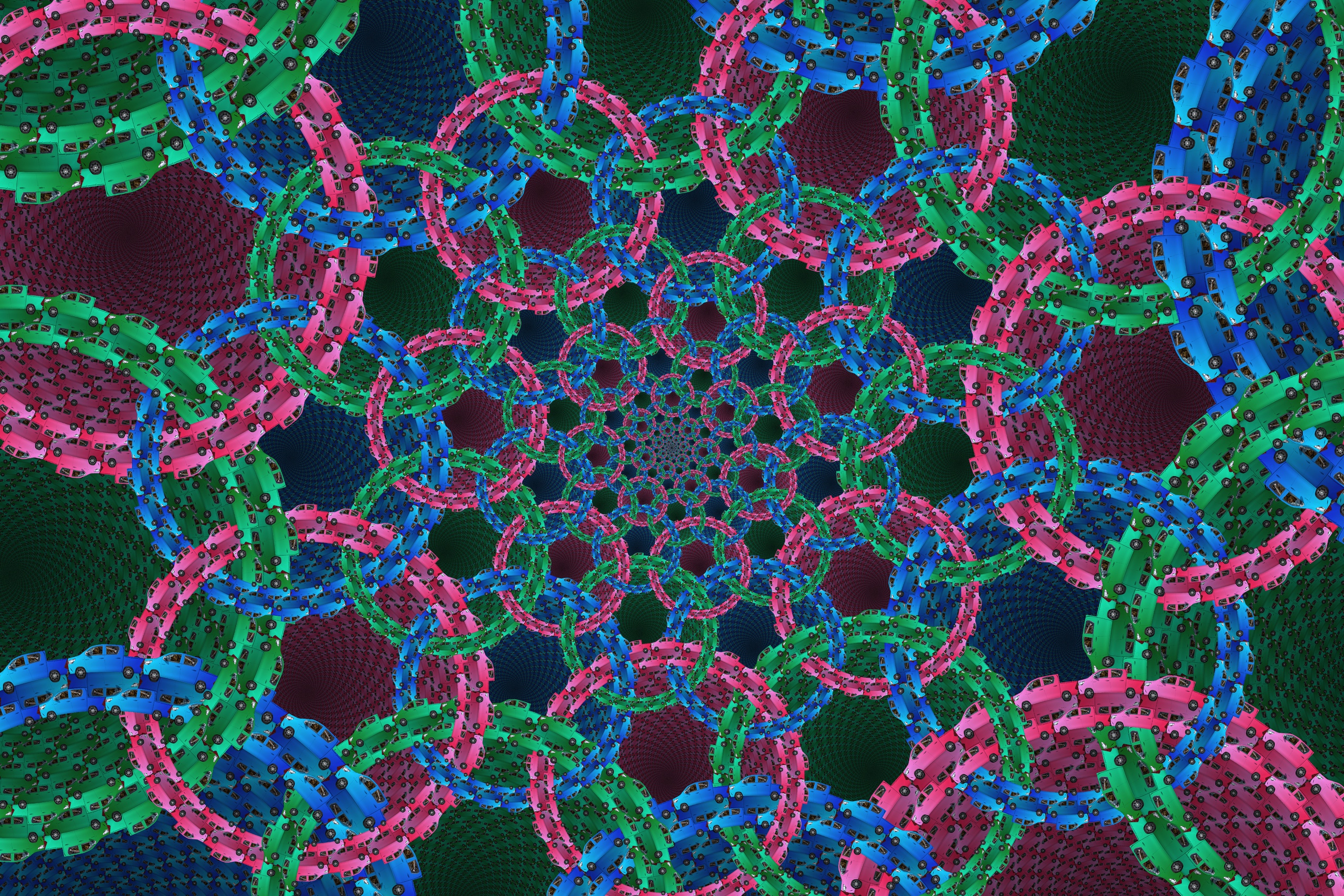 Doyle-cirkels raken elkaar precies met verschillende stralen en een spiraalvormig hexagonaal patroon. In deze afbeelding is de rand van de cirkels zo doorgetrokken dat aangrenzende randen in elkaar grijpen. De rand en het interieur van een cirkel bestaan uit een vlakvulling van auto's. De Doyle-configuratie van P = 9 en Q = 12 kan worden gecontroleerd door te starten vanaf de rode cirkel in de linker benedenhoek. Met de klok mee omhoog gaande langs 9 buurcirkels eindig je in dezelfde cirkel als je naar rechts gaat tegen de klok in langs 3 buurcirkels. Verder met de klok mee gaande langs nog eens 3 cirkels eindig je bij de derde cirkel van de derde spiraalarm tussen de twee eerder genoemde spiraalarmen. Overigens vormde M.C. Escher's Snakes de inspiratie voor deze afbeelding.