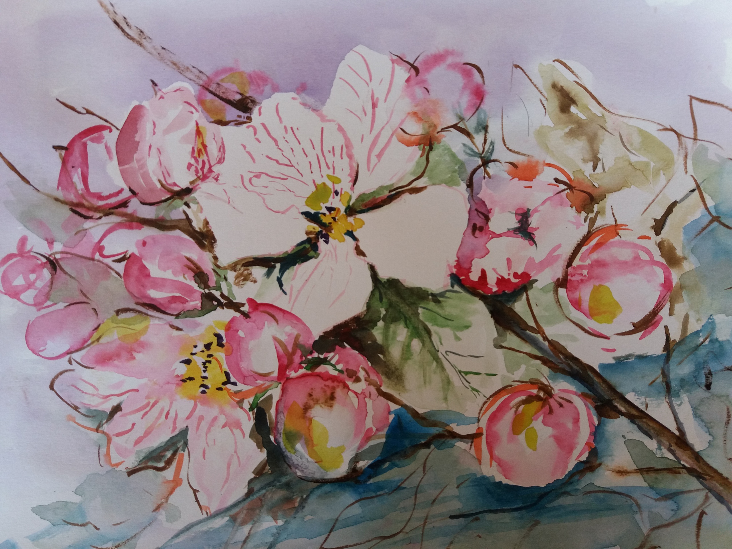 Appelbloesem in blad, aquarel in lichte en iets donkere tinten