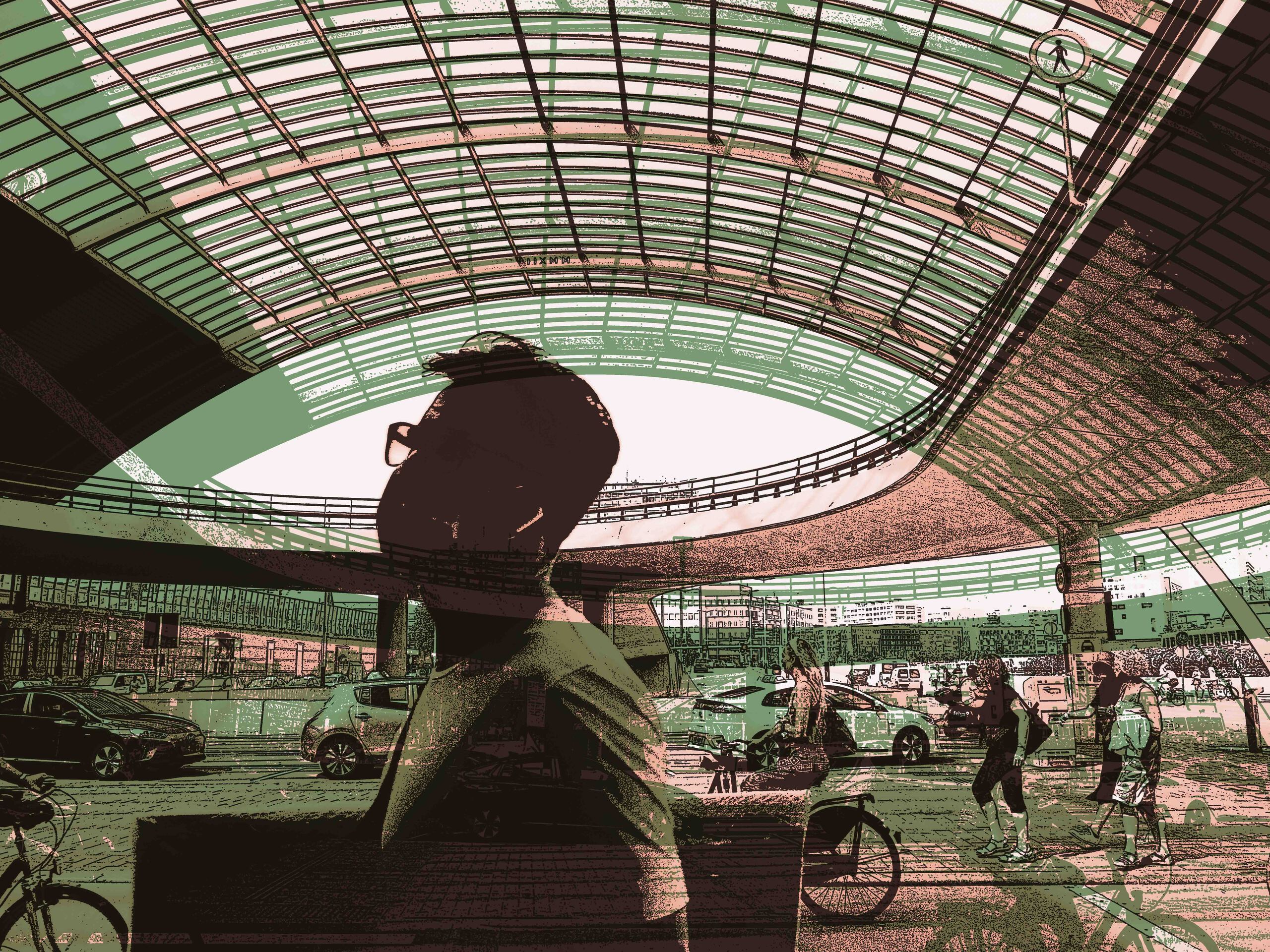 'Mondkapje bij Amsterdam-centraal. ' * te koop digitale art-print, 75 x 60 cm, prijs: € 450 (inclusief lijst, of op dibond) (diverse formaten zijn mogelijk, naar uw wens - de prijs variëert dan mee)