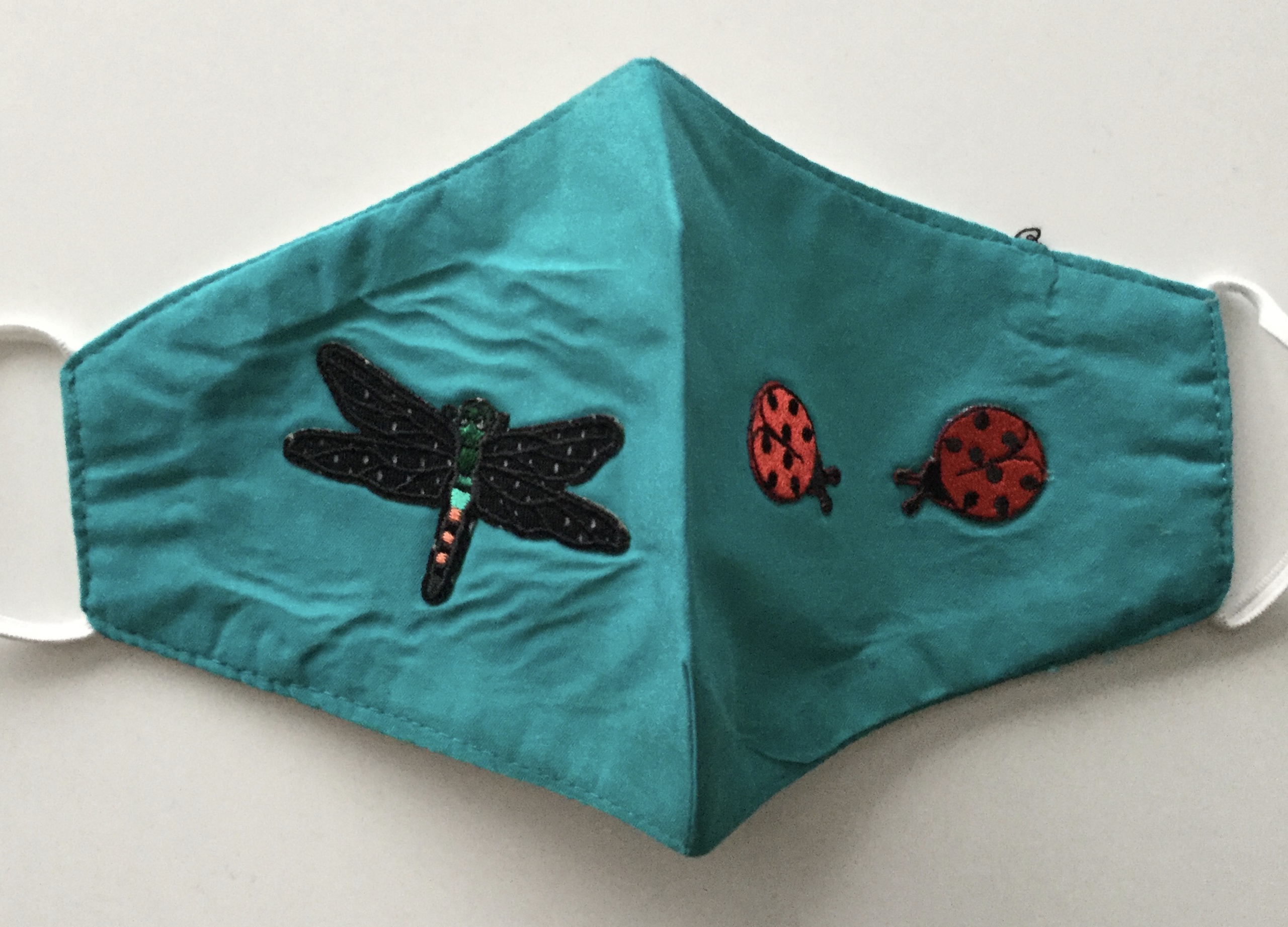 Groenblauw mondmasker met patches van lieveheersbeestje en libelle