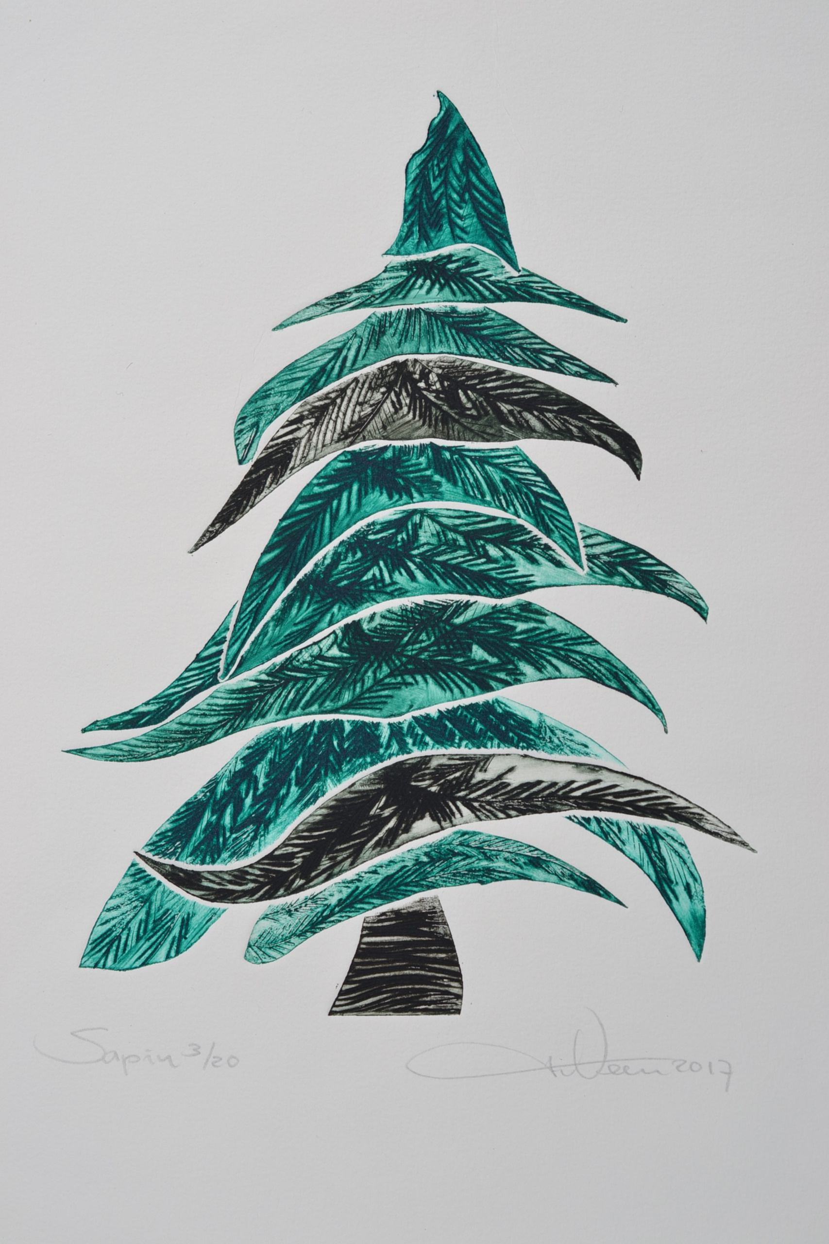 Kerstboom - Sapin - droge naald en aquatint - uitgezaagde zinkplaatjes - meerkleuren druk - oplage 1/20