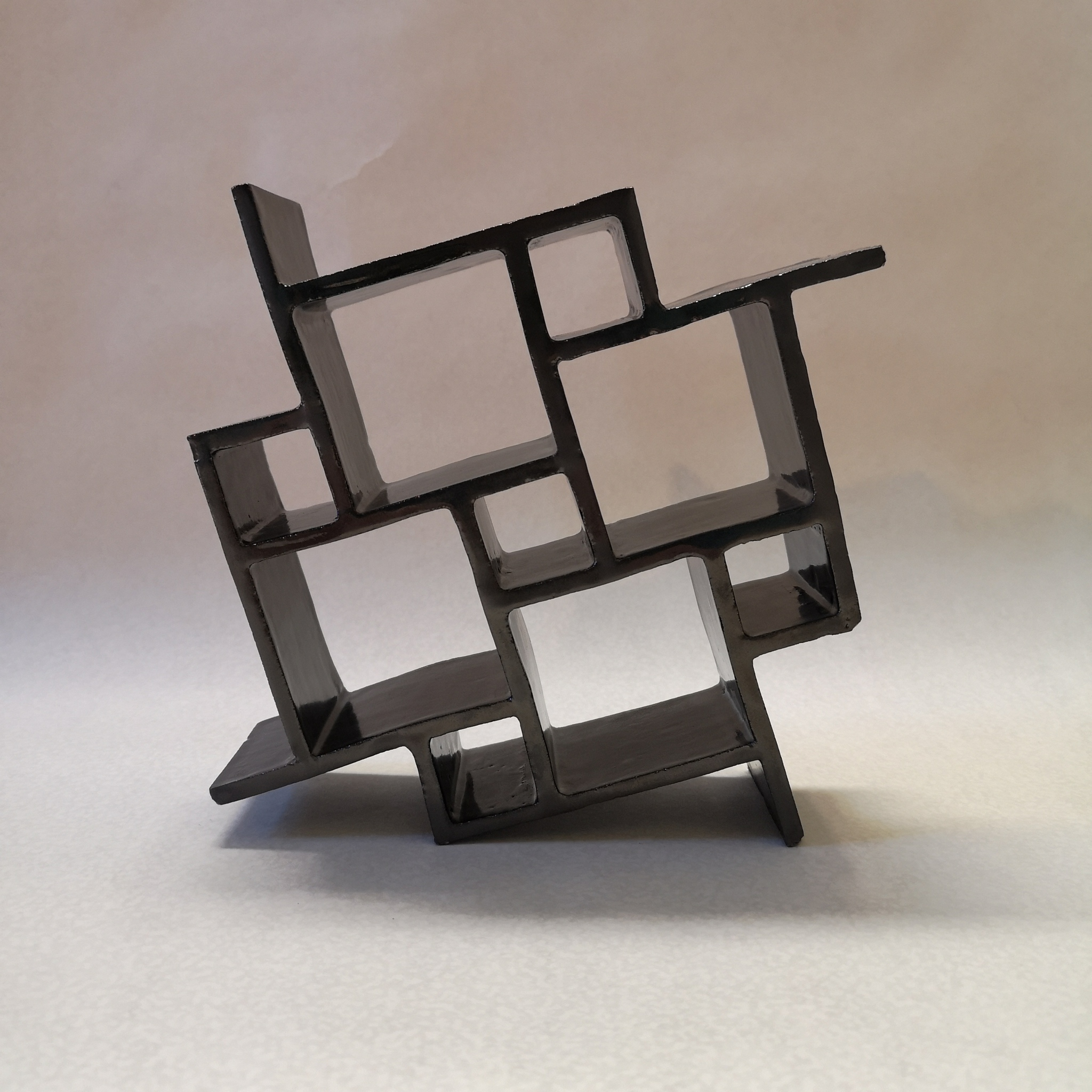 Dit werk is opgebouwd uit dunne platen wit bakkende klei. Na een eerste biscuitstook is er een metaal-kleurige glazuur aangebracht waarna het is gestookt op 1050'C. Het object bestaat uit een geheel van vierkanten die tot een architectonische compositie verbonden zijn. Afmetingen zijn 20 x 20 x 5 cm Het betreft een uniek exemplaar. De werken worden zorgvuldig verpakt voor verzending, inclusief een Certificate of Authenticity