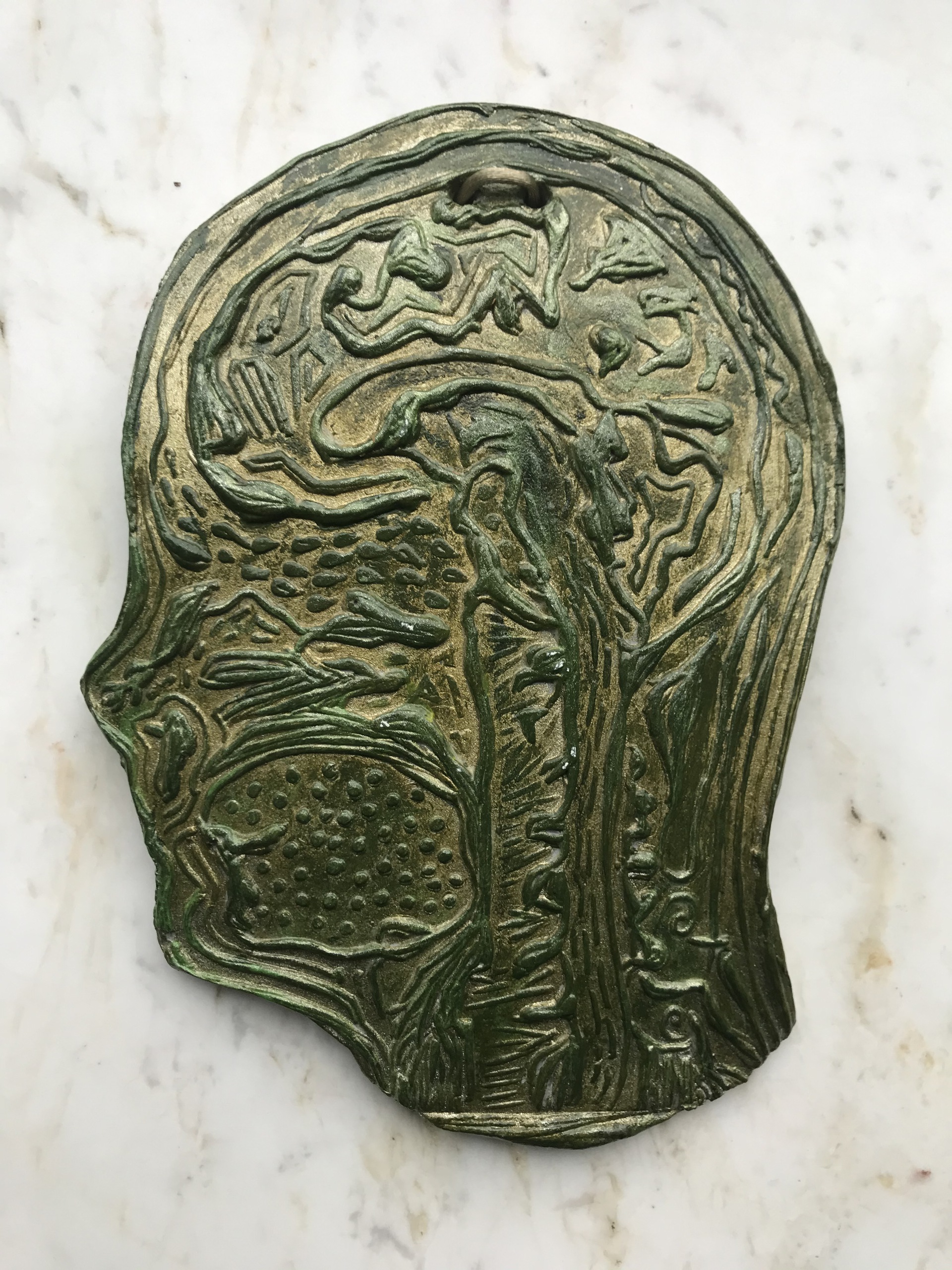 Kleitablet, dubbelzijdige afdruk met aan beide zijden beschildering. Inspiratiebron het mysterieuze brein. Een zijde is menselijk brein, andere zijde is afdruk van een groot hoefblad.