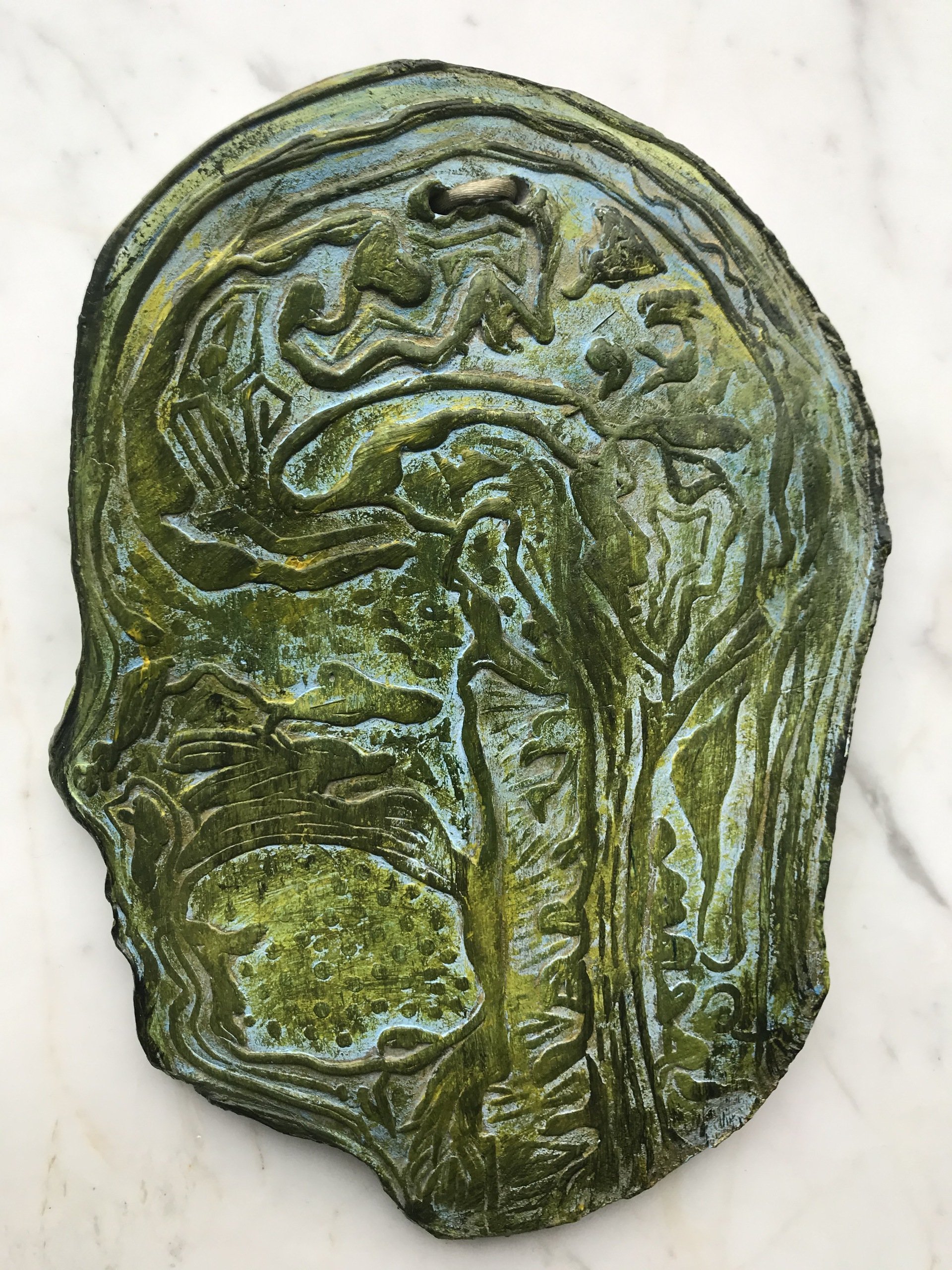Kleitablet, dubbelzijdige afdruk, enerzijds brein en profiel, anderzijds blad. Aan beide kanten beschilderd. Voorzien van ophangdraad. Kan naar keuze worden neergelegd als kunstobject of worden opgehangen als wandobject