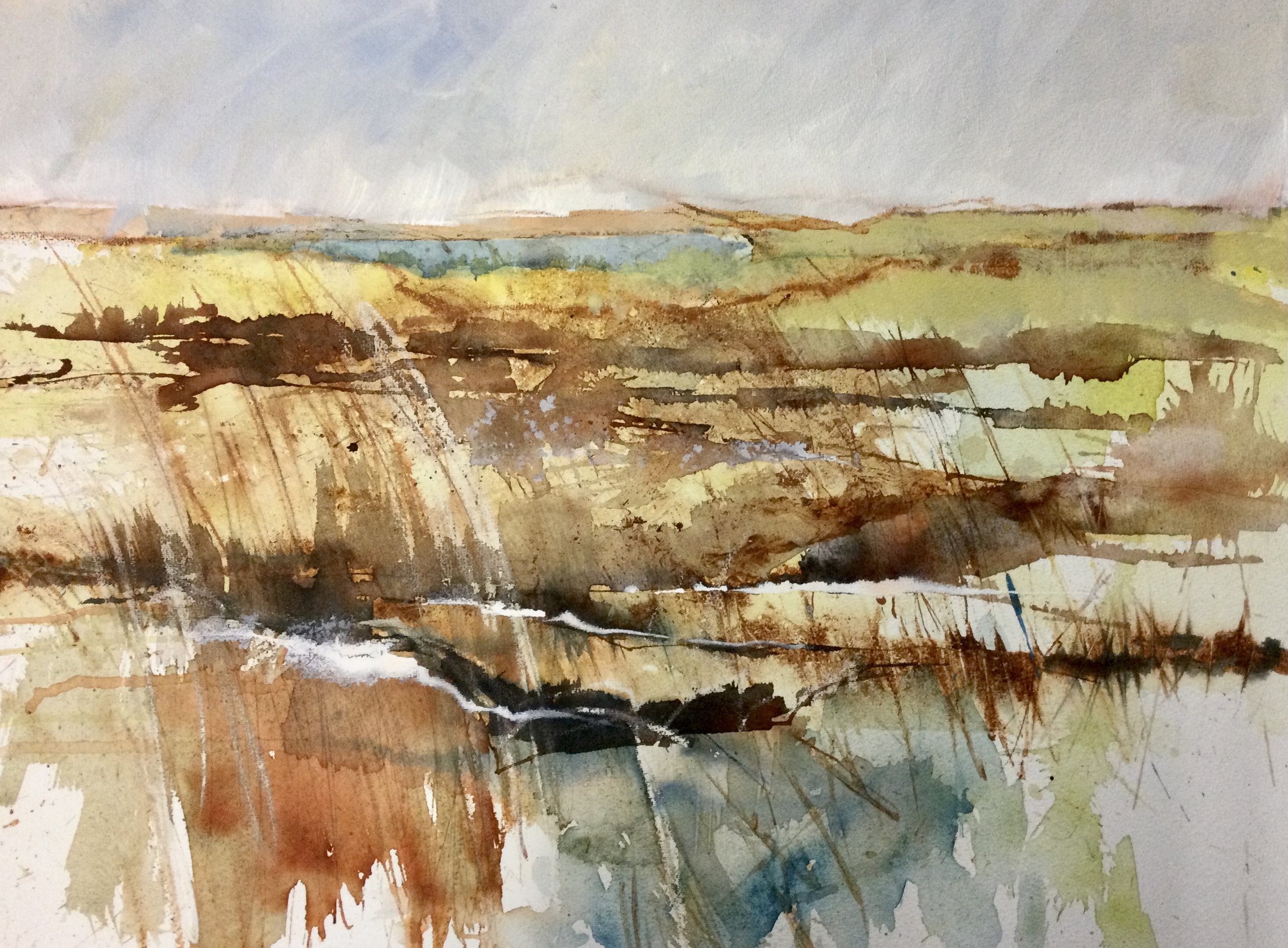 Een aquarel met gemengde techniek over grassen ,heuvels in warme kleuren. In de verte zie je een klein watertje. Wordt geleverd in passe- partout en voor een kleine meetprijs kan ik hem voor u inlijsten