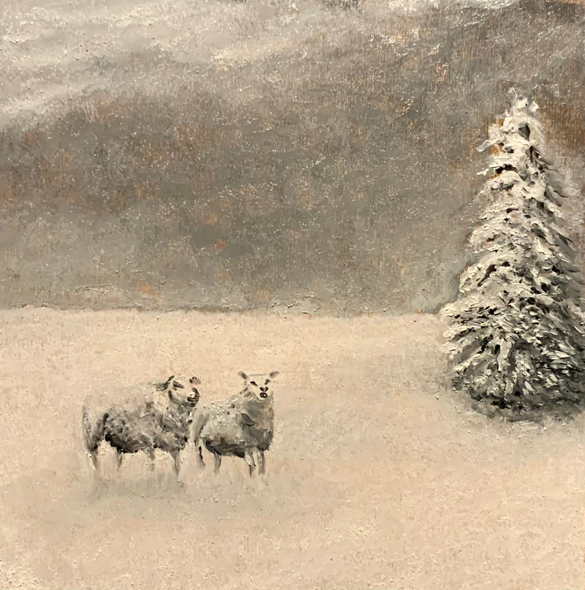 Een schilderijtje van een tweetal schaapjes in een wnterse setting.