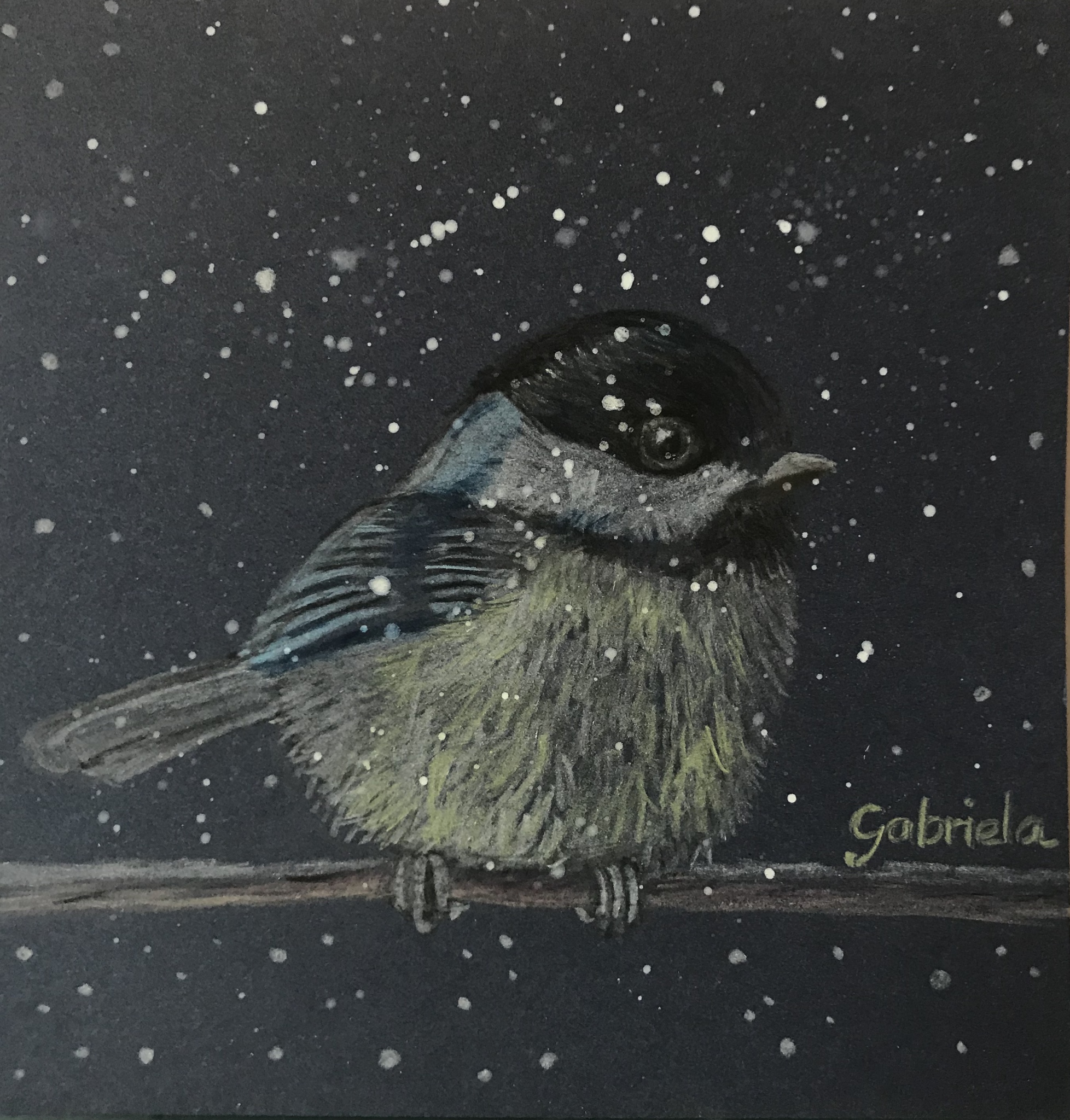 Kleurpotlood tekening op donkerblauw papier van een zwarte mees in de sneeuw.