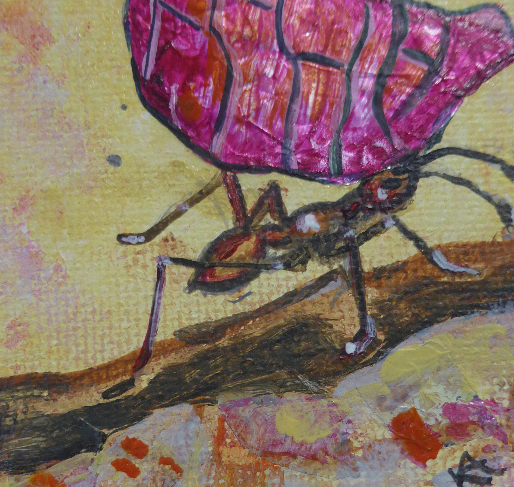 Parasolmier met gekleurd stuk blad. Miniatuurschilderij.