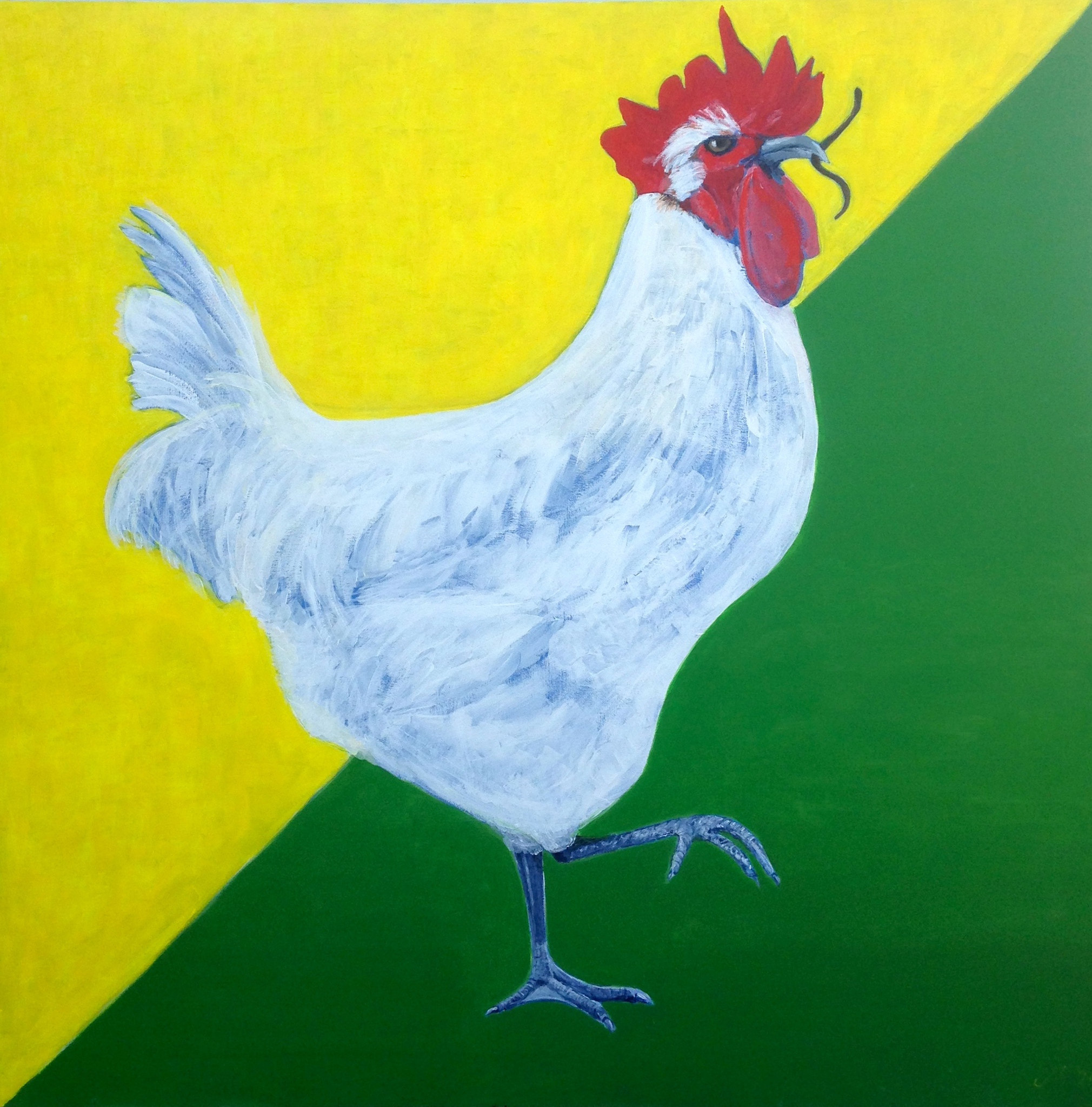 Een kip uit de Bresse, waar ik nu woon met de Haagse kleuren op de achtergrond en een worm in zijn bek, verwijzend naar de ooievaar op het Haagse vaandel.