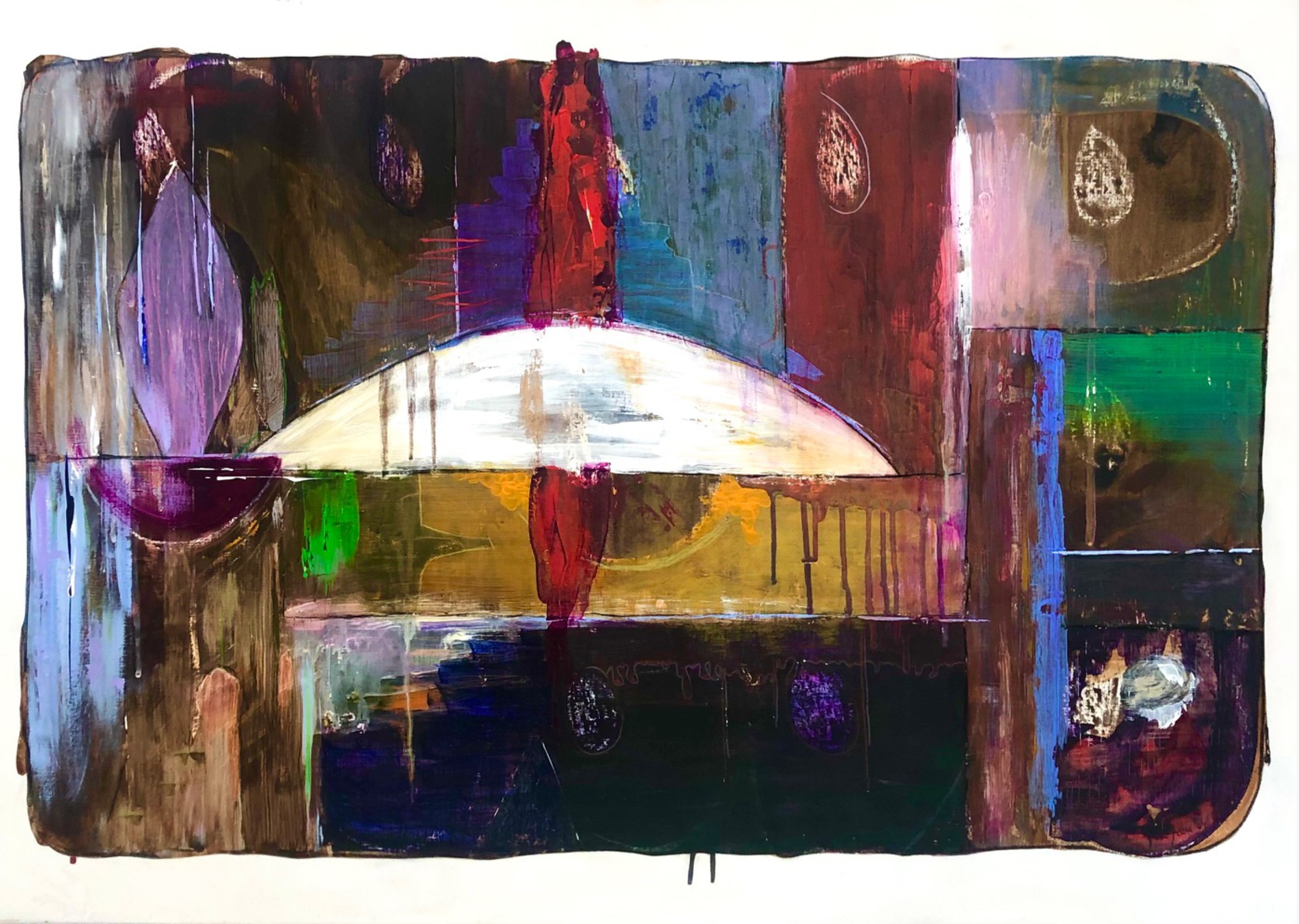 Finding ground, 80x60cm. Nog een schilderij dat moeilijk te fotograferen is. Er zit namelijk nog een zachtblauwe rand omheen, wat een heel andere indruk geeft. Helaas accepteert dit programma de oneffen randen niet, dus moet ik het kleiner croppen.