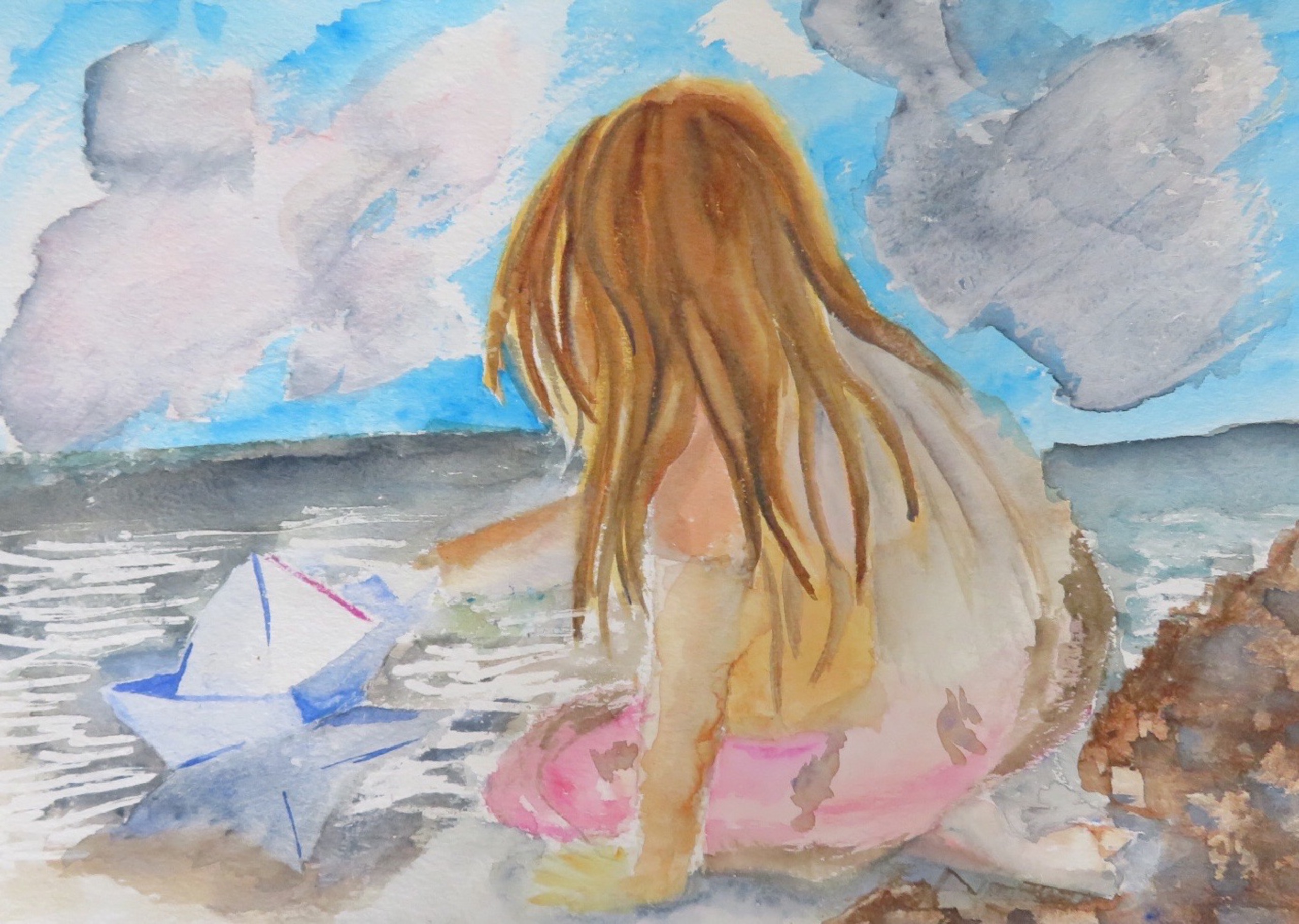 Undine plays with her paper boat. she misses her father, who has been at sea for months. this illustration is from the picture book for young and old "Undine"
