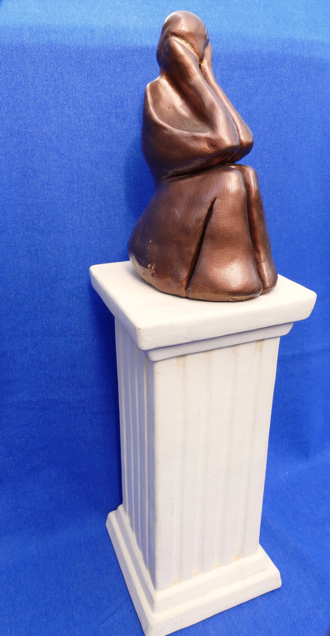 Een vrije interpretatie op het bekende beeld: De Denker. Leverbaar met gipsen standaard, dan totale hoogte: 52 cm Op verzoek meerdere foto's.