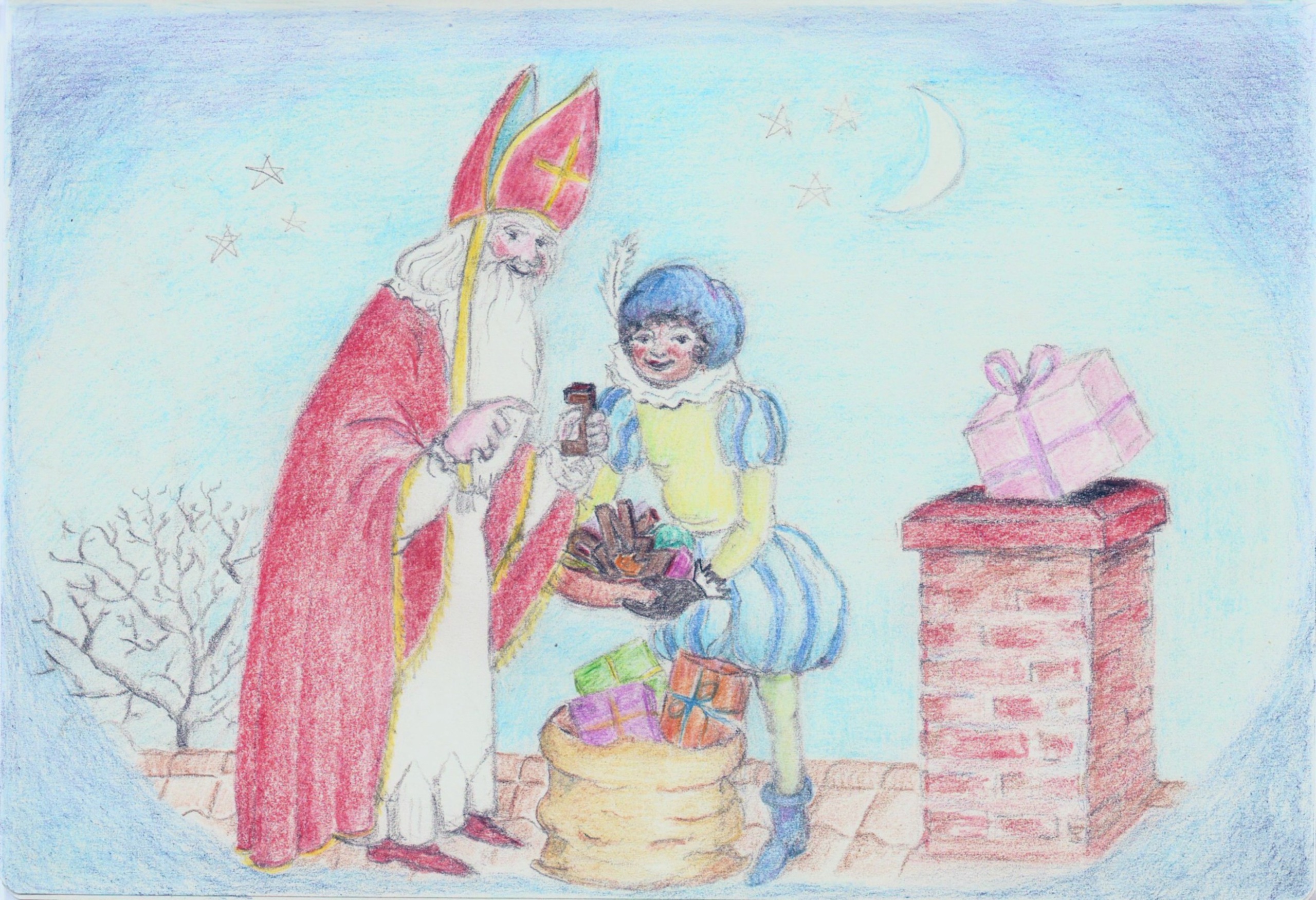 Sint en Piet op het dak met cadeautjes.
