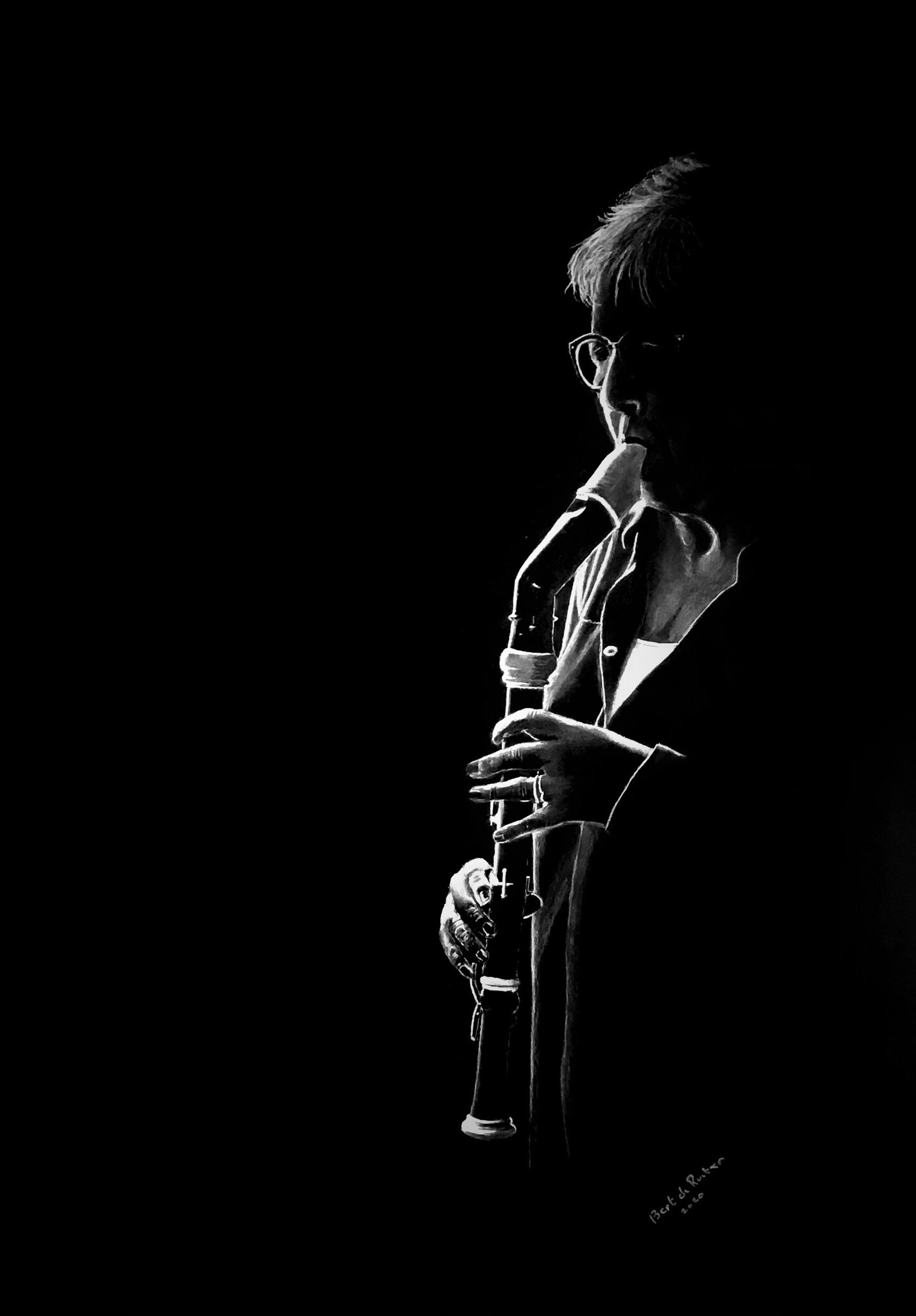 Tenorblokfluitist in schijnwerpers geplaatst, getekend met witkrijt op zwart papier.