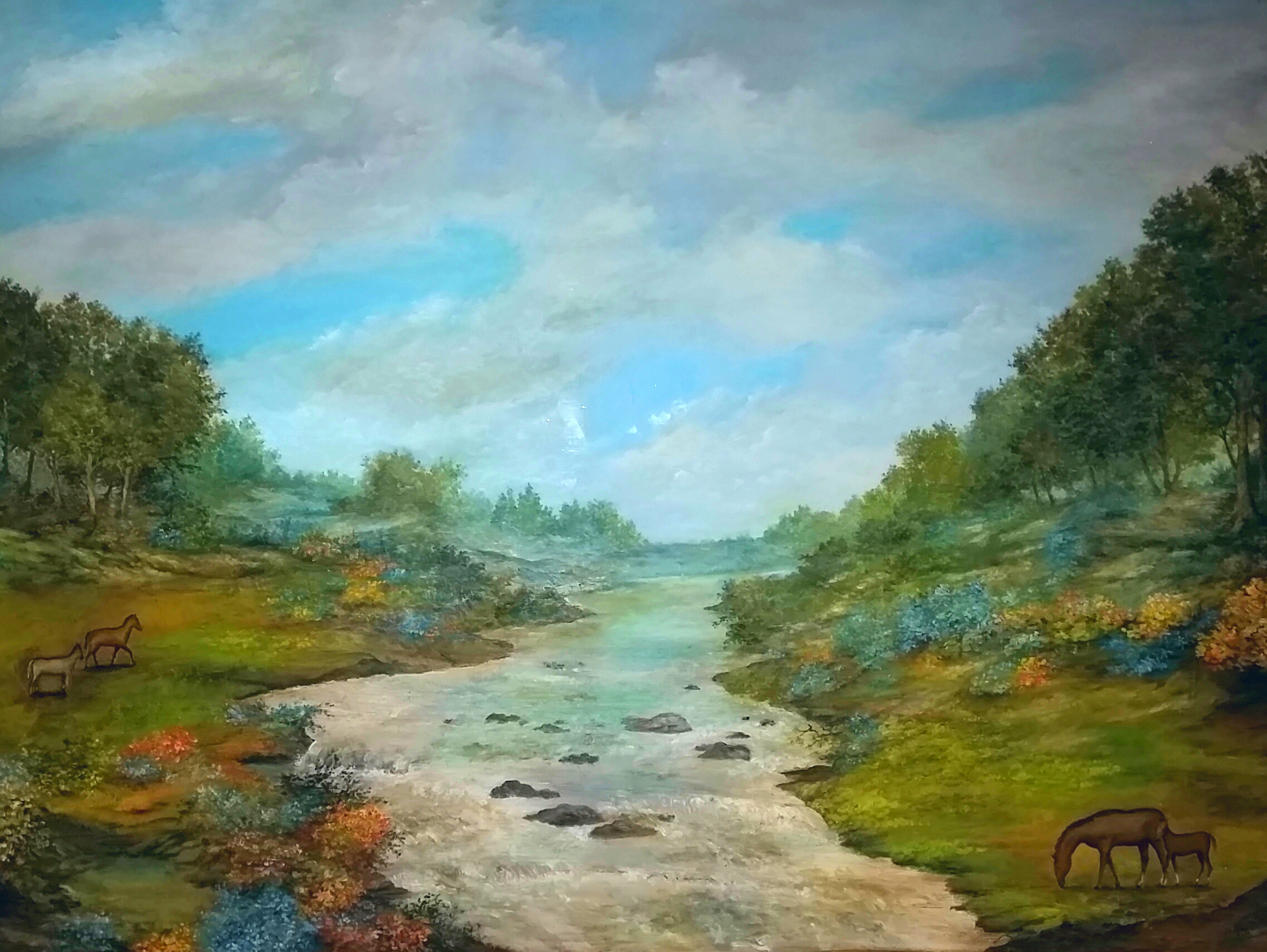 Landschap met stromende rivier en paarden....geschilderd in 2020 volgens eigen impressie