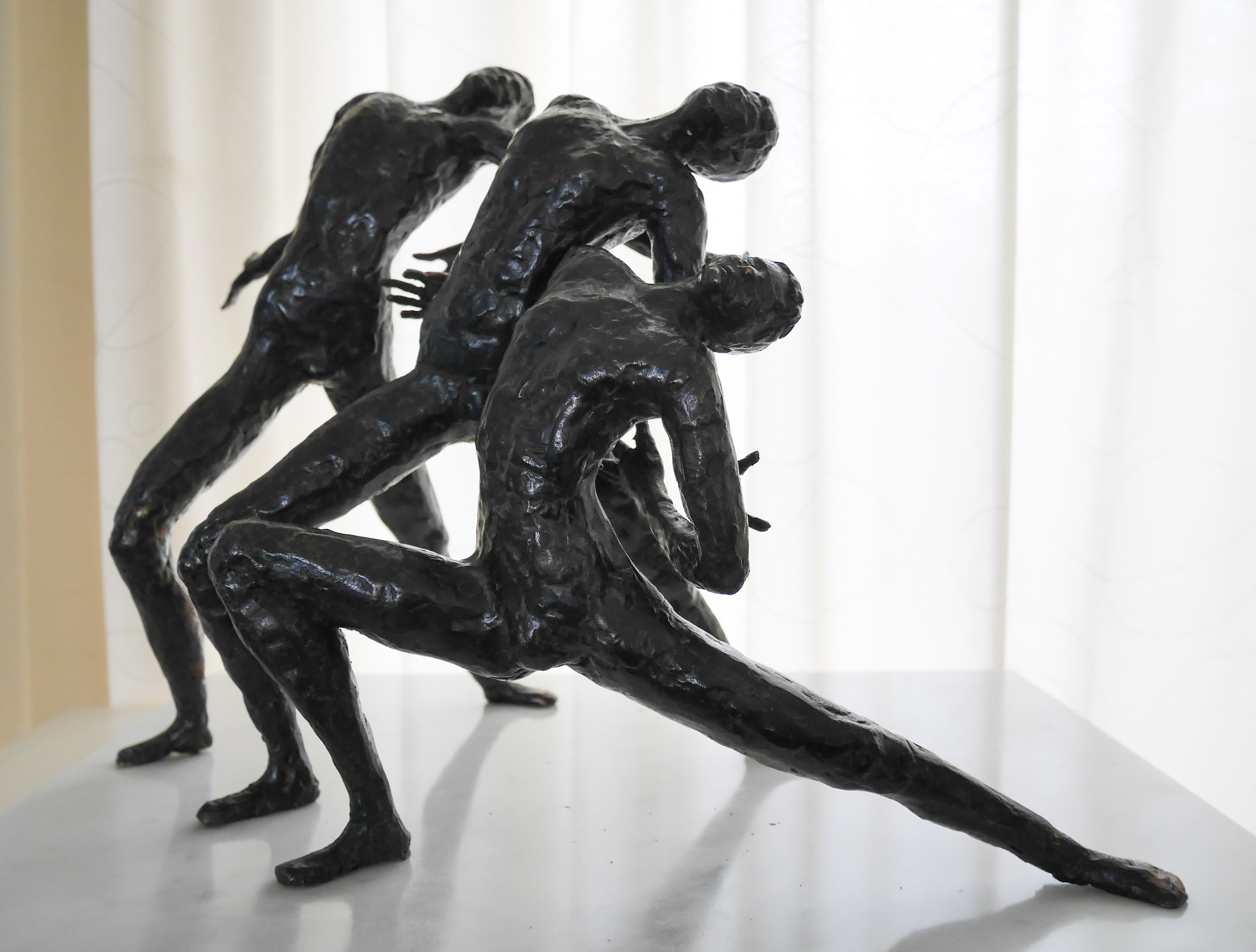 3 dansers in een eindpose van hun voorstelling. Op marmeren sokkel.