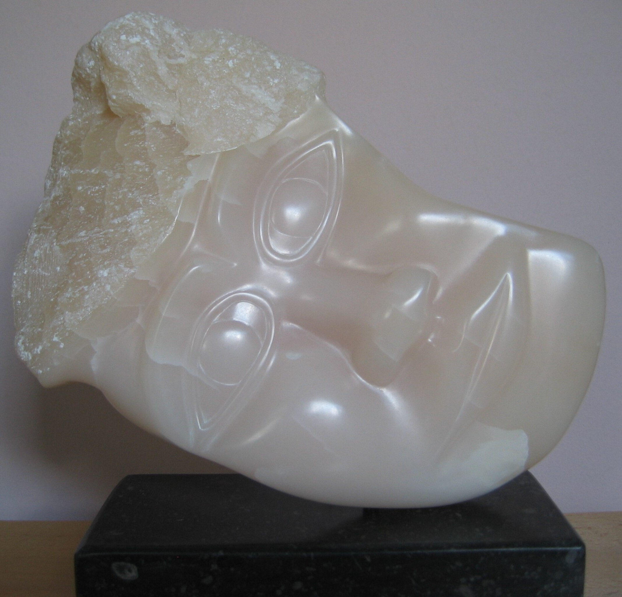 Gezicht van roze speksteen op een sokkel van Belgisch hardsteen. Titel: "De smachtende tovenaar" of "De dromende tovenaar".