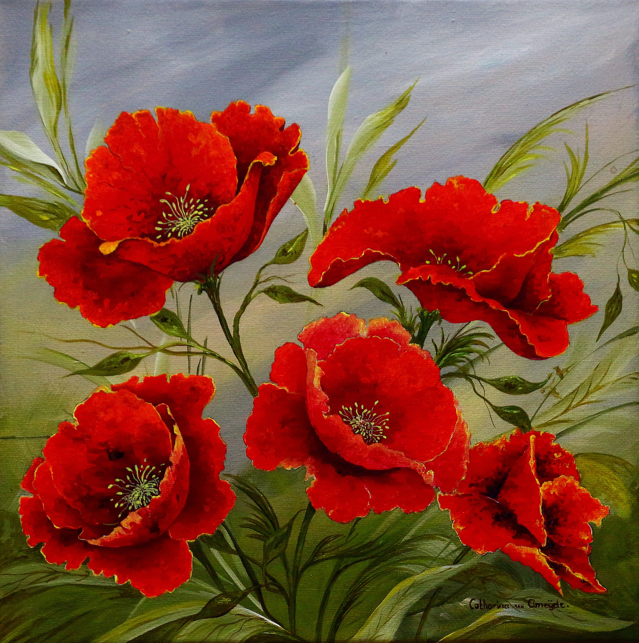 Klaprozen, Kleine wilde klaproos met felrode bloemen. Coquelicots, Petit pavot sauvage à fleur rouge vif.