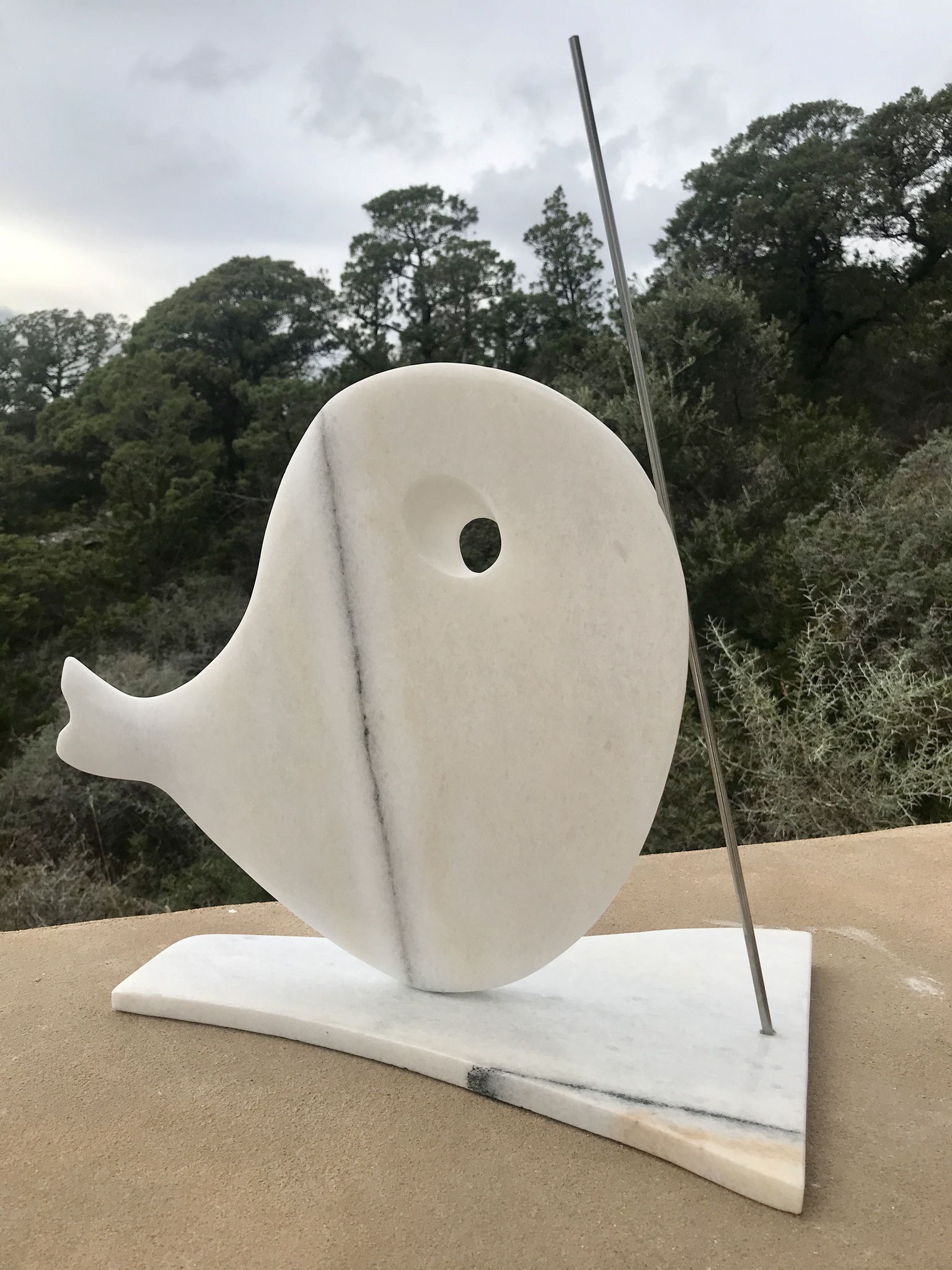 Een vrouwelijke wereld uit steen geboren. Mijn beelden dragen “het eeuwig vrouwelijke” in zich. Zij vertegenwoordigen mijn communicatie met de steen, de lijnen en structuren die zijn ontstaan door de tijden en de steen haar eigen taal geeft. Met name het samengaan van mijn innerlijke taal en die van de steen is één van de boeiende aspecten van het werken met steen: het bevrijden van een nieuwe wereld uit het eens zo vormeloze.