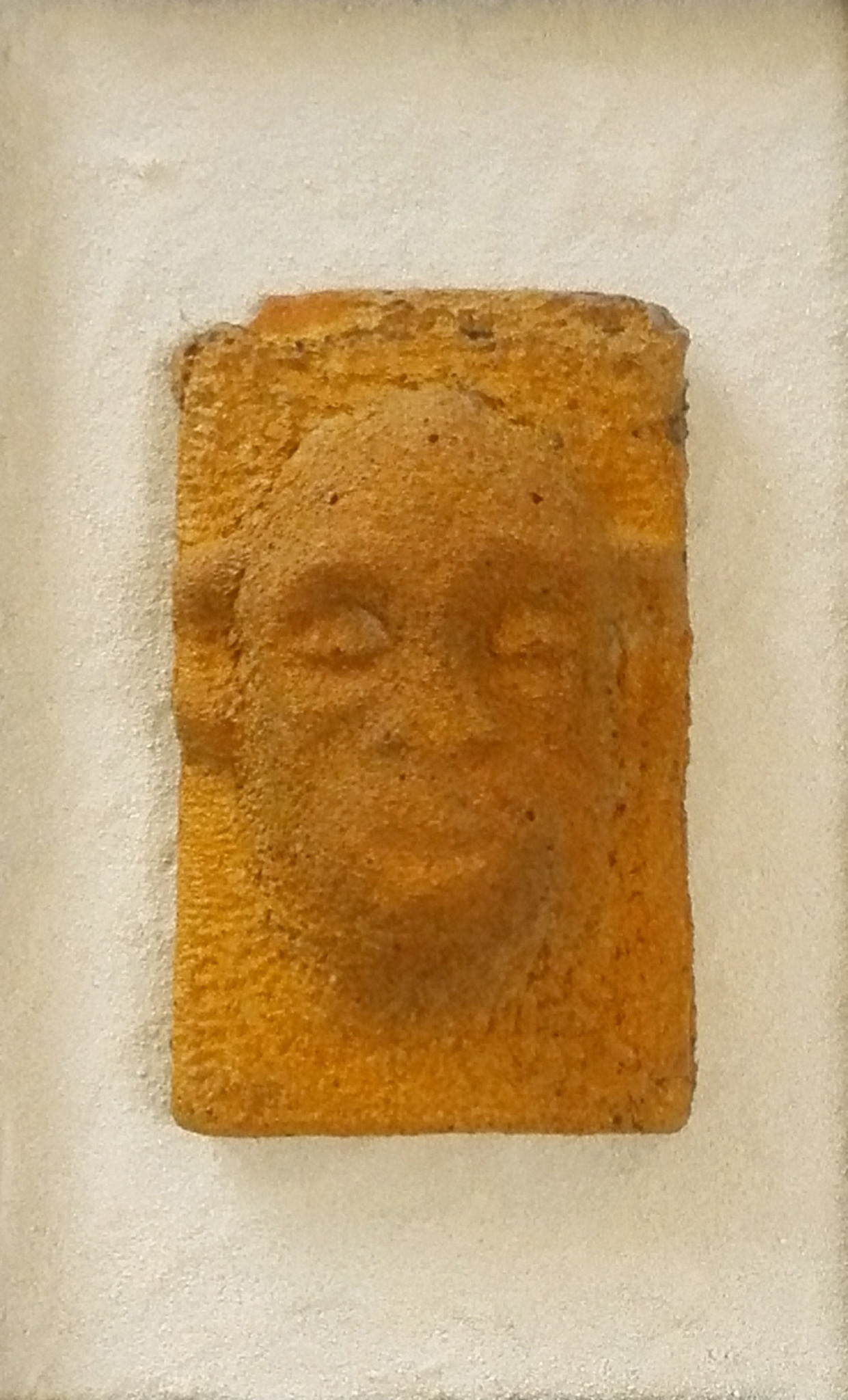 Portretje van jonge chimp, slapend. Kopje gegoten in acrylhars met ijzerpoeder, geoxideerd; bevestigd op mergelsteenvlak en ingelijst in leisteen (lijst niet op foto). (Gietsel 3 van 4)