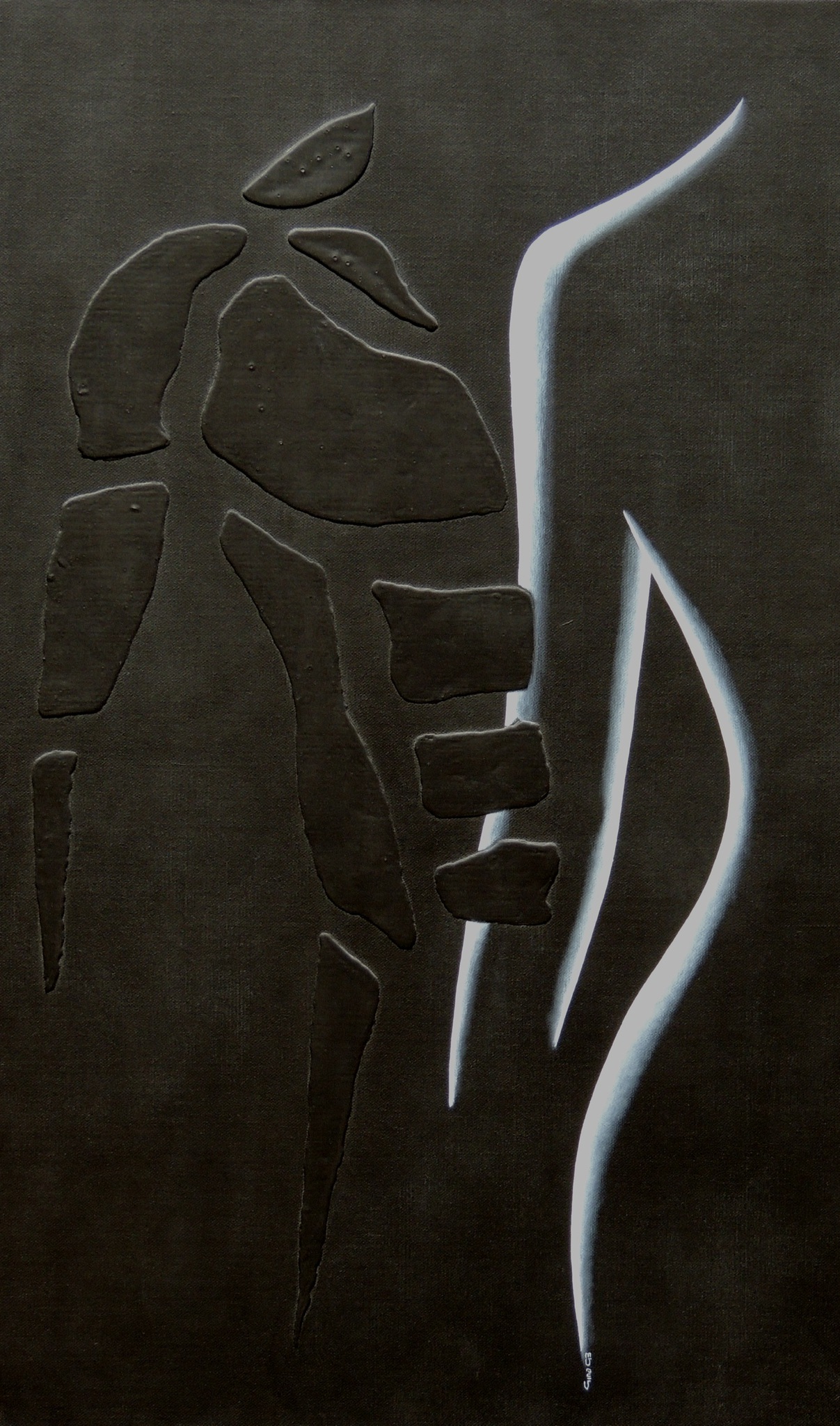 Man en vrouw verbonden in structuur en lijn. Olieverf en structuur op doek. 100 x 60 x 4 cm.