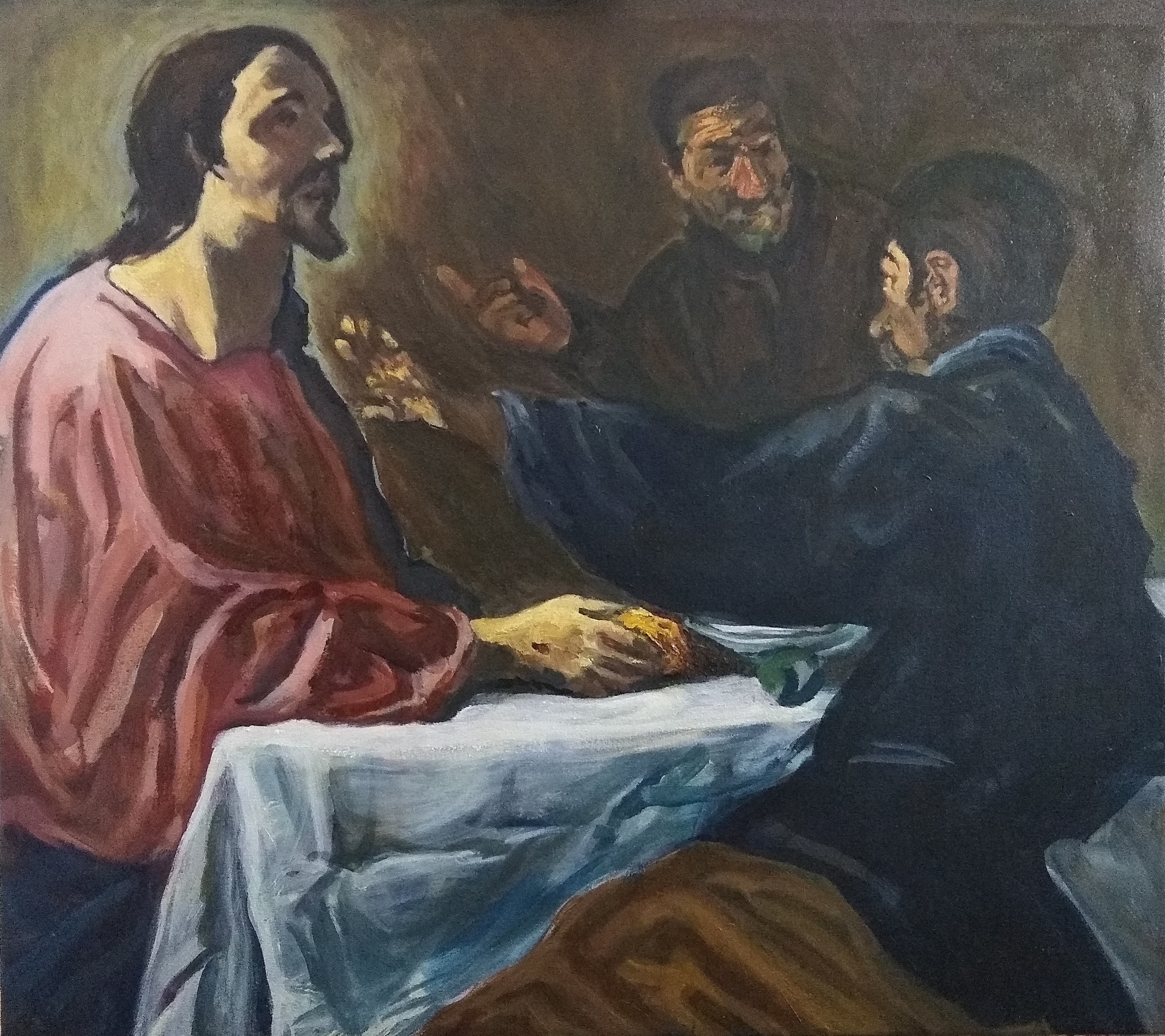 "Supper at Emmaus" (naar Diego Velázquez) Olieverf op doek - Ongesigneerd - 2020 Mooie kopie van "Maaltijd te Emmaus" ("Supper at Emmaus" after Diego Velázquez). Zonder lijst, eventueel voor meerprijs leverbaar). Komt goed tot z'n recht in religieuze omgeving; kerk, parochie, religieuze gemeenschap oid. Moet over een jaar nog een slotvernis krijgen (i.v.m. droging), welke ik u gratis als service aanbiedt.