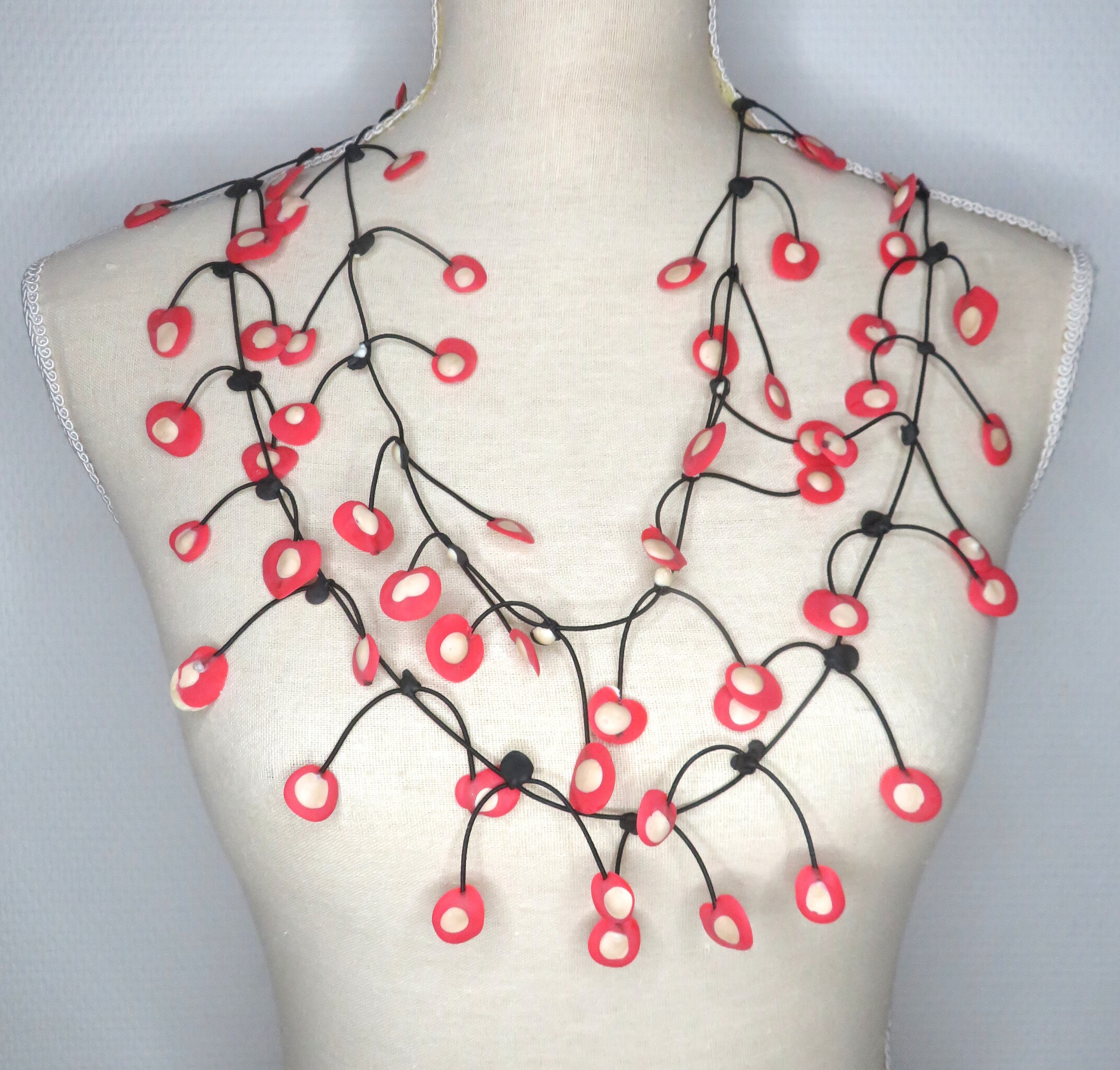 Ketting met van rubber met rood witte bolletjes, De ketting is handgemaakt en dus uniek. Geeft een mooi effect op een egale jurk of bloese. Een echt statement ketting