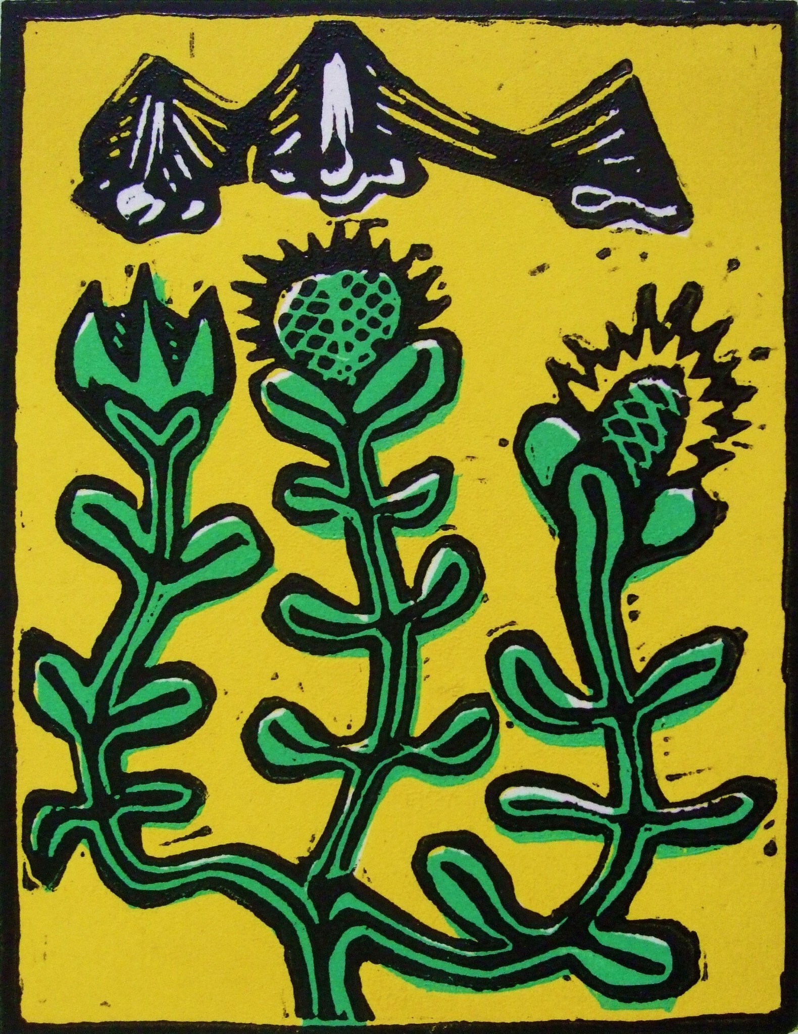 Prentje cadeau (kleine meer-kleuren linosnede, met passe-partout in aluminium of eikenhouten lijstje, formaat A4) € 125,-- inclusief verzendkosten Voorbeelden te zien bij de informatie pagina’s