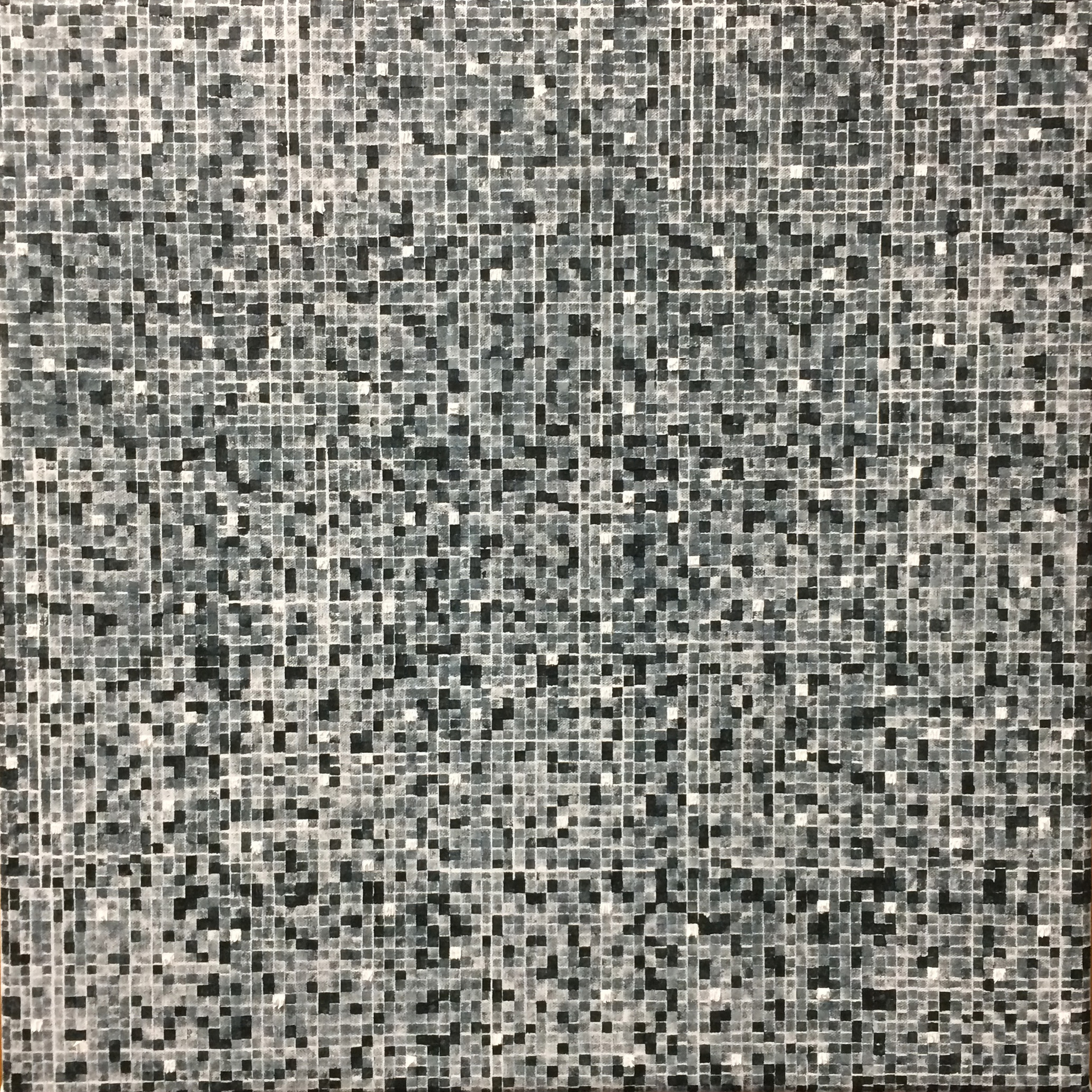 Thema: Chaos (Geometrische Chaos) Mijn kunst is beïnvloedt door de moderne wiskundige en wetenschappelijke benadering van het begrip complexe orde van de natuur. Met name heb ik me verdiept in de Chaos theorie en de fractal geometrie. Ik ben geen wiskundige, en ik gebruik geen wiskundige formules. De ideeën van de Chaos theorie en fractal geometrie leiden tot de ontwikkeling van de composities in mijn werk. Ik gebruik driehoeken,vierkanten en cirkels in mijn schilderijen, maar in mijn huidige serie, geoChao richt ik me alleen op de vierkanten en de verhoudingen tussen de vierkanten. Ik ontwikkel mijn composities door kleine vierkantjes op grote te zetten of grote op kleine te zetten. Het gaat om de onderlinge verhoudingen tussen de vierkanten. Ik laat de methode die ik kies de compositi