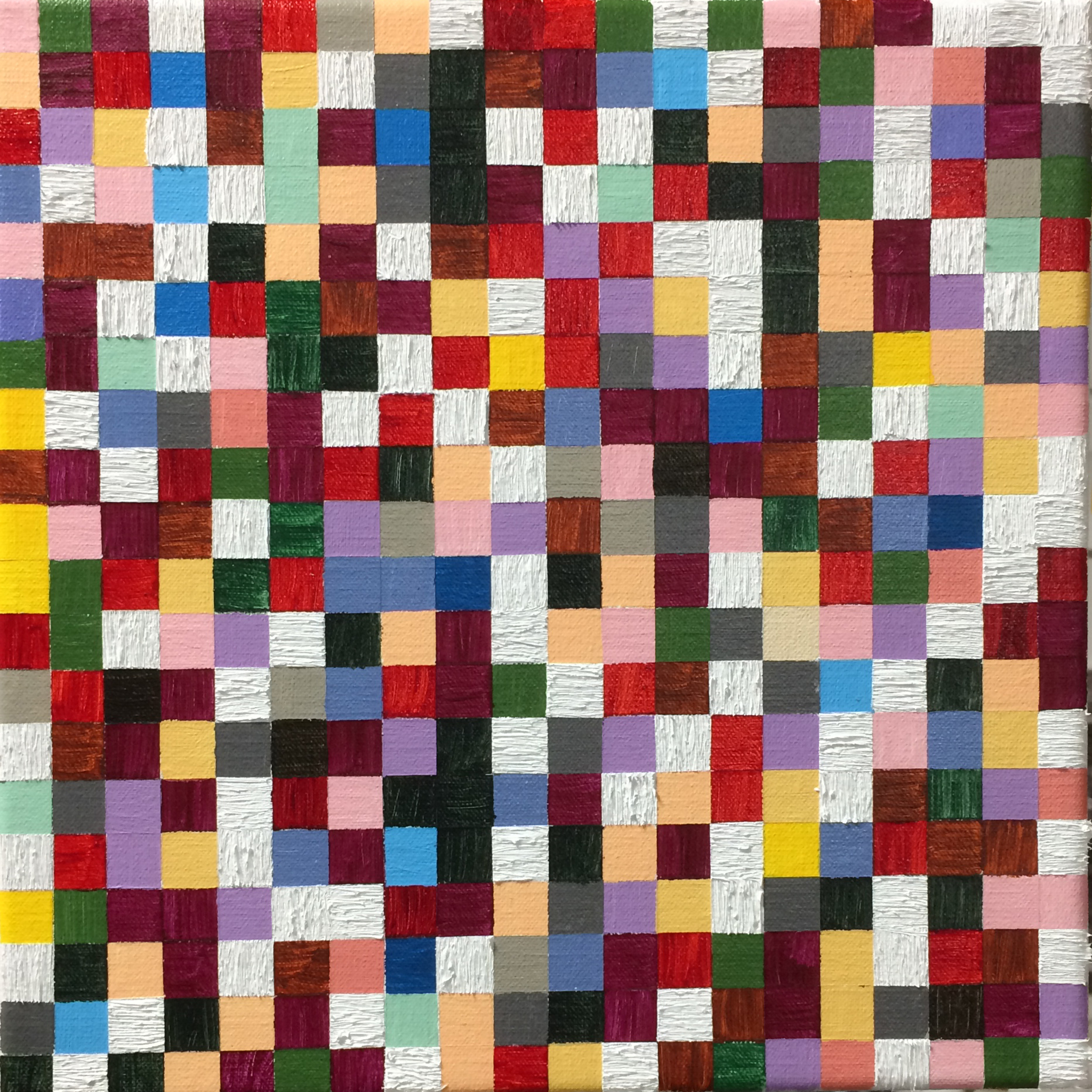 Thema: Chaos (Geometrische Chaos) Mijn kunst is beïnvloedt door de moderne wiskundige en wetenschappelijke benadering van het begrip complexe orde van de natuur. Met name heb ik me verdiept in de Chaos theorie en de fractal geometrie. Ik ben geen wiskundige, en ik gebruik geen wiskundige formules. De ideeën van de Chaos theorie en fractal geometrie leiden tot de ontwikkeling van de composities in mijn werk. Ik gebruik driehoeken,vierkanten en cirkels in mijn schilderijen, maar in mijn huidige serie, geoChao richt ik me alleen op de vierkanten en de verhoudingen tussen de vierkanten. Ik ontwikkel mijn composities door kleine vierkantjes op grote te zetten of grote op kleine te zetten. Het gaat om de onderlinge verhoudingen tussen de vierkanten. Ik laat de methode die ik kies de compositi