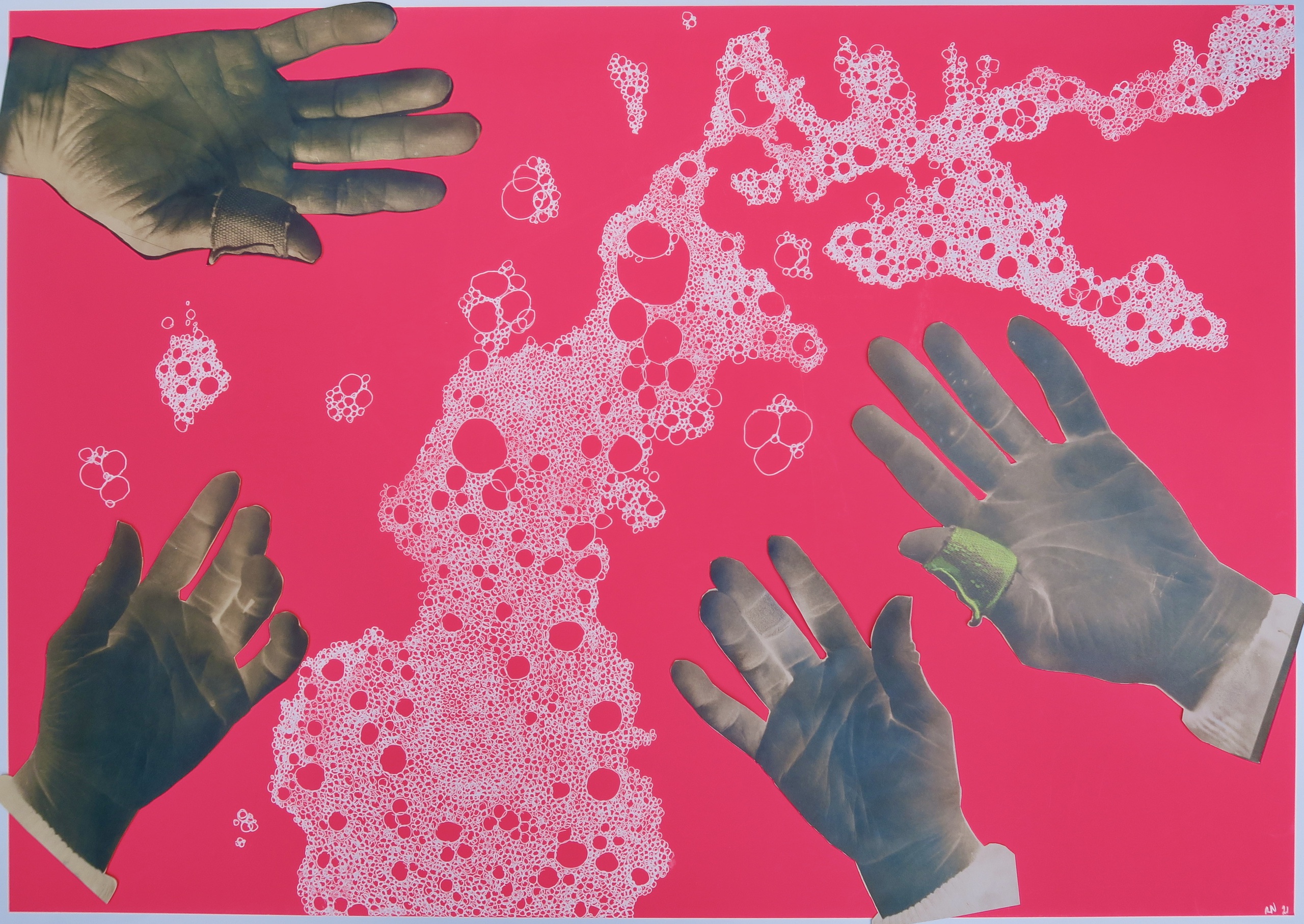 Wit Roze Handen Collage Stift Schuim Virus Neon Corona Zeep